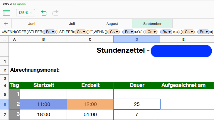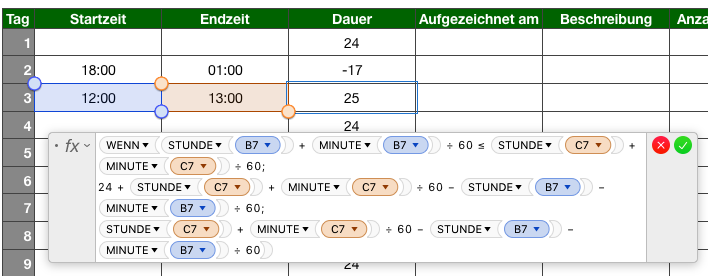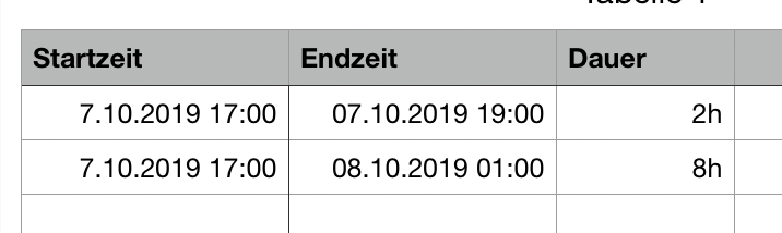 ich möchte in Numbers einen Tätigkeitsnachweis erstellen. Letztendlich geht es darum aus zwei Uhrzeiten die Dauer zu berechnen. Die Besonderheit ist, dass Numbers bei einer Tätigkeit über 0:00 Uhr hinaus falsch rechnet. Bei einer Schicht von 18:00 Uhr bis 01:00 Uhr rechnet Numbers -17h. Ist auch logisch, da 1-18=17 ist. Aus diesem Grund rechne ich hinten in der Formel +24 und bekomme das richtige Ergebnis.