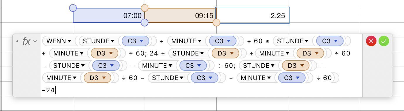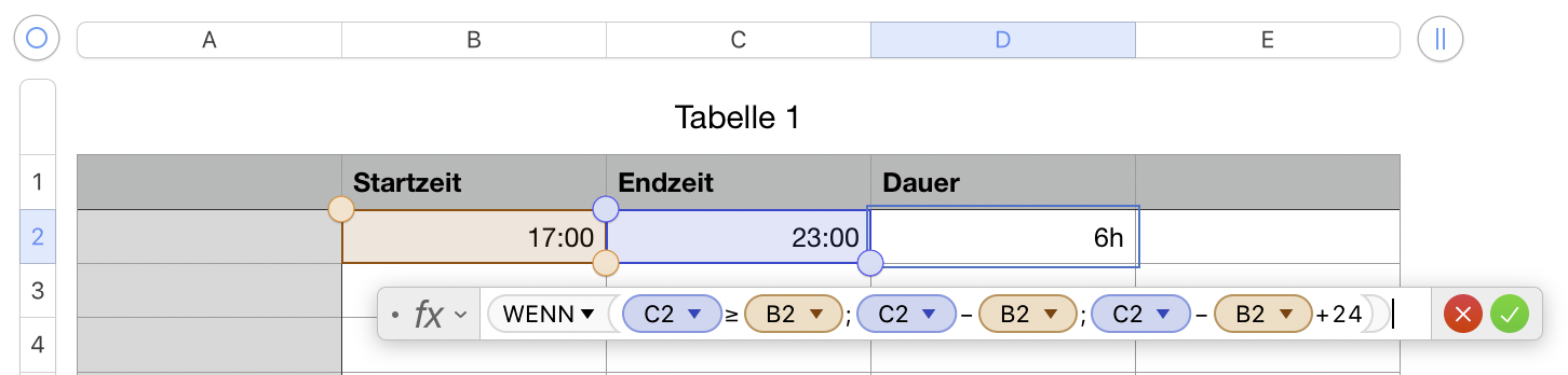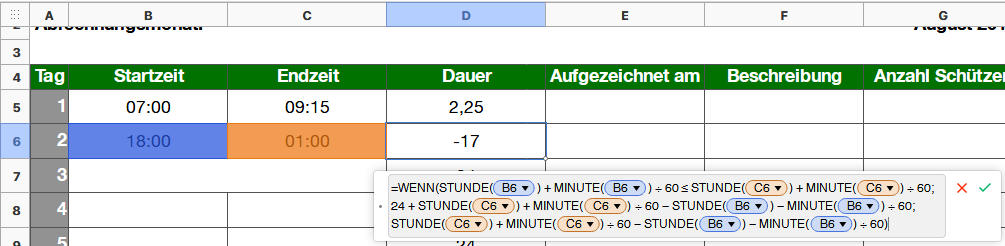 ich möchte in Numbers einen Tätigkeitsnachweis erstellen. Letztendlich geht es darum aus zwei Uhrzeiten die Dauer zu berechnen. Die Besonderheit ist, dass Numbers bei einer Tätigkeit über 0:00 Uhr hinaus falsch rechnet. Bei einer Schicht von 18:00 Uhr bis 01:00 Uhr rechnet Numbers -17h. Ist auch logisch, da 1-18=17 ist. Aus diesem Grund rechne ich hinten in der Formel +24 und bekomme das richtige Ergebnis.