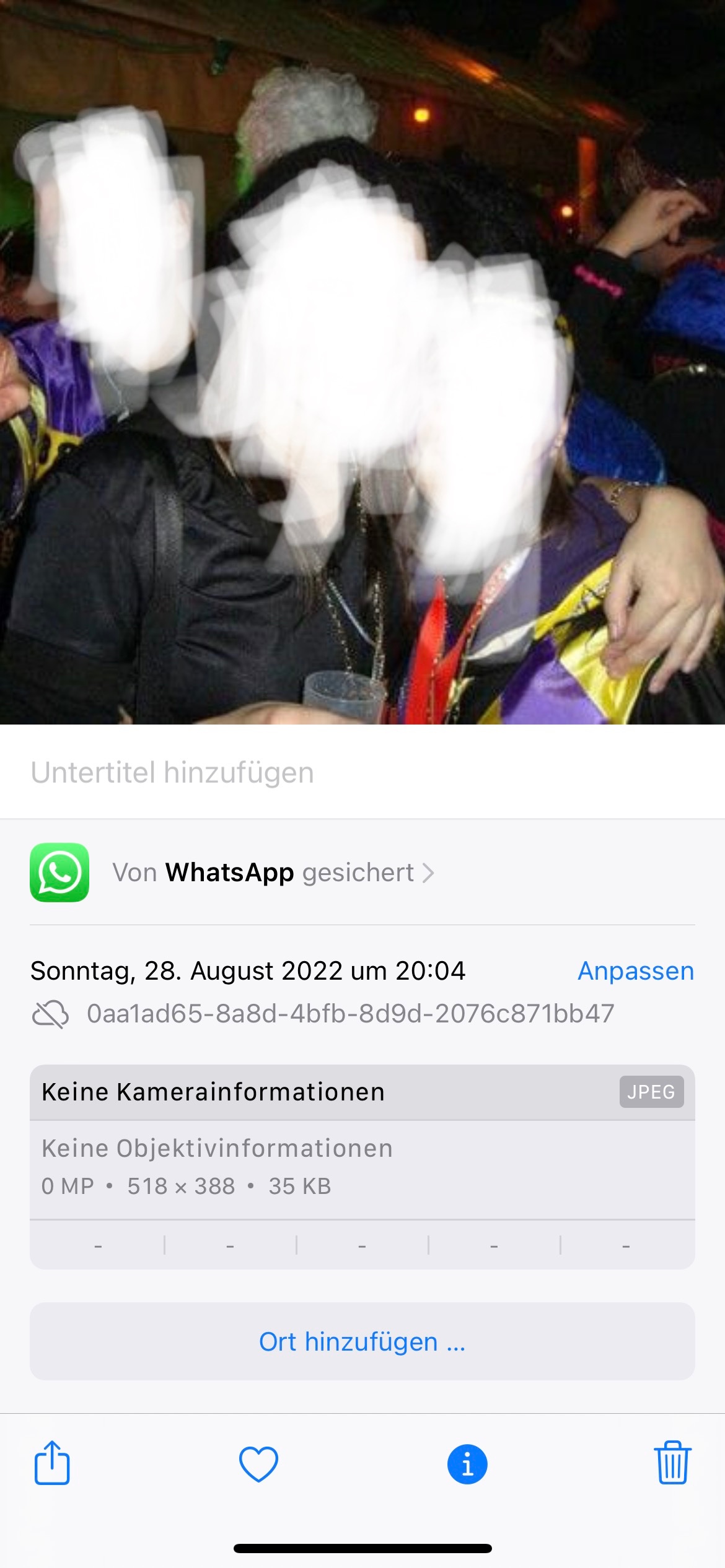 ABER: Beste Qualität ist bei WhatsApp immer noch eine sehr geringe Auflösung von ca. 2 Megapixeln mit starker Komprimierung. Zur Anzeige auf den kleinen Handydisplays genügt das, alles andere sieht meist wenig schön aus. Für die Gesichtserkennung sollte es aber oft genügen.