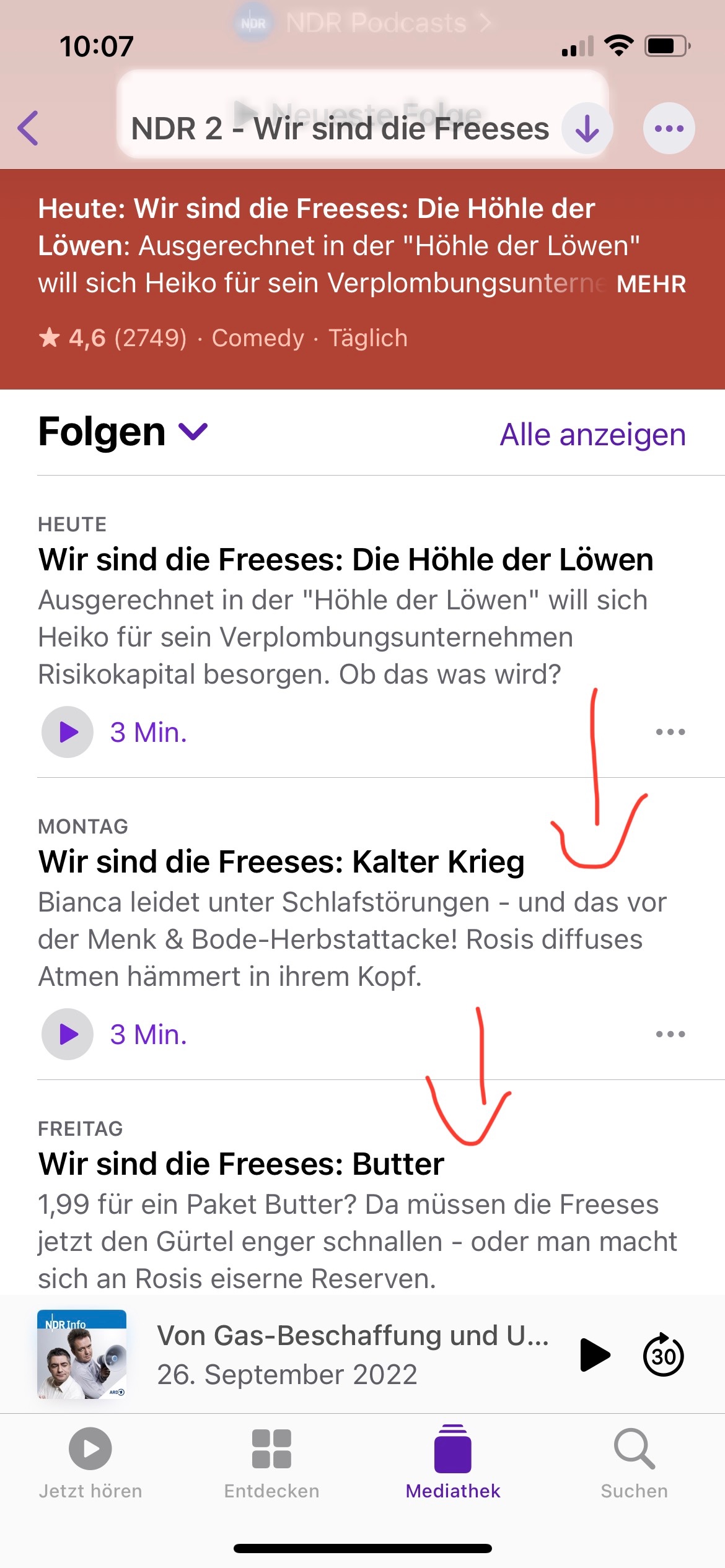 Apple Podcast App. Nachdem Abspielen einer bereits gehörten Folge eines Podcasts springt die App nicht mehr zur nächsten Folge des gleichen Podcasts sondern zur neusten Folge eines anderen abonnierten Podcasts. Bis zum Update auf IOS16 funktionierte dies. Ich habe keine Einstellung geändert.
