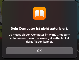 Was bedeutet in der App Bücher auf meinem MacBook Air diese Nachricht, die erscheint sobald ich versuche, ein auf meinem iPhone gekauftes Buch auf dem Laptop zu öffnen? Was ist zu tun? Kann ich mit beiden Geräten auf meine Buchsammlung zugreifen, oder nicht? Danke.