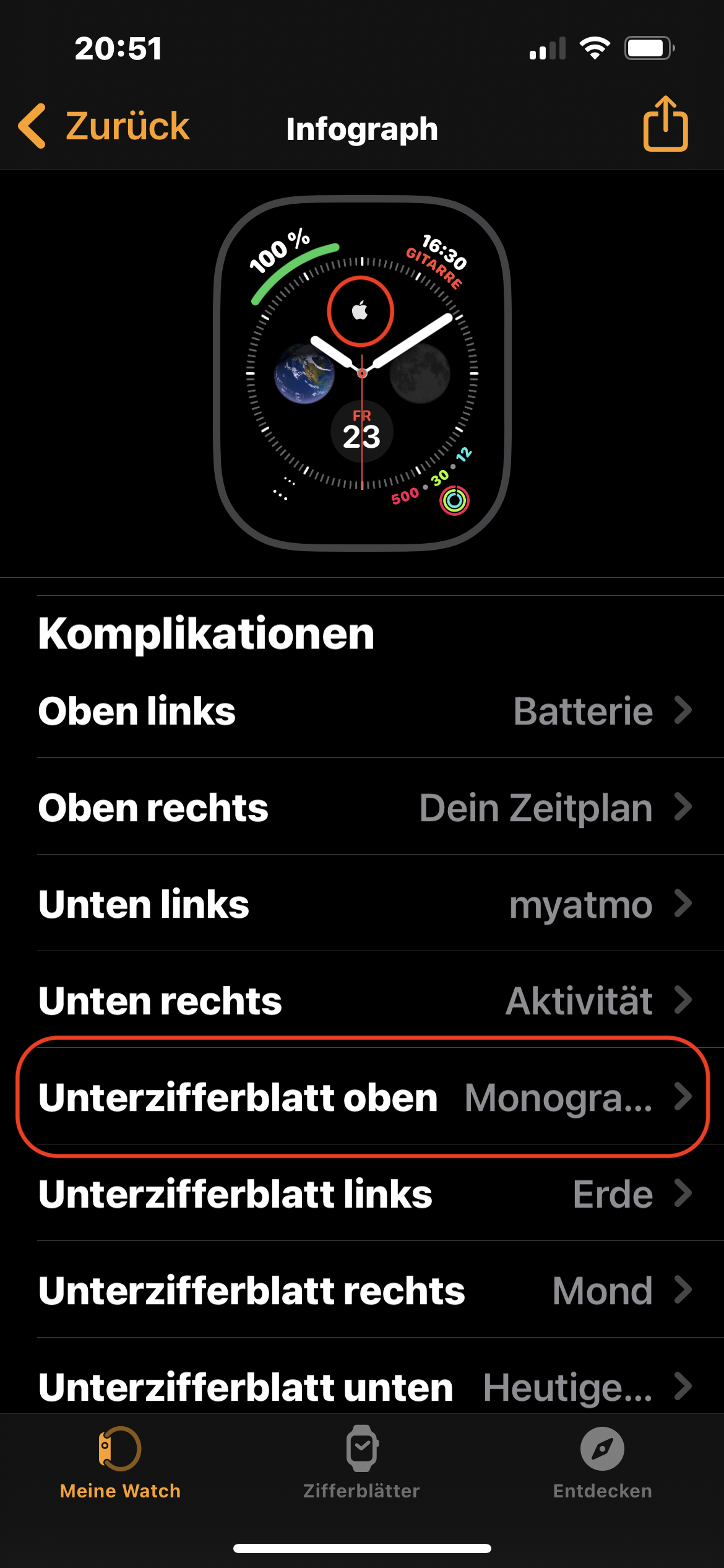 In der Liste findest du die ausgewählten Komplikationen. Auf diesem Bild habe ich als Monogramm ein Logo eingeblendet