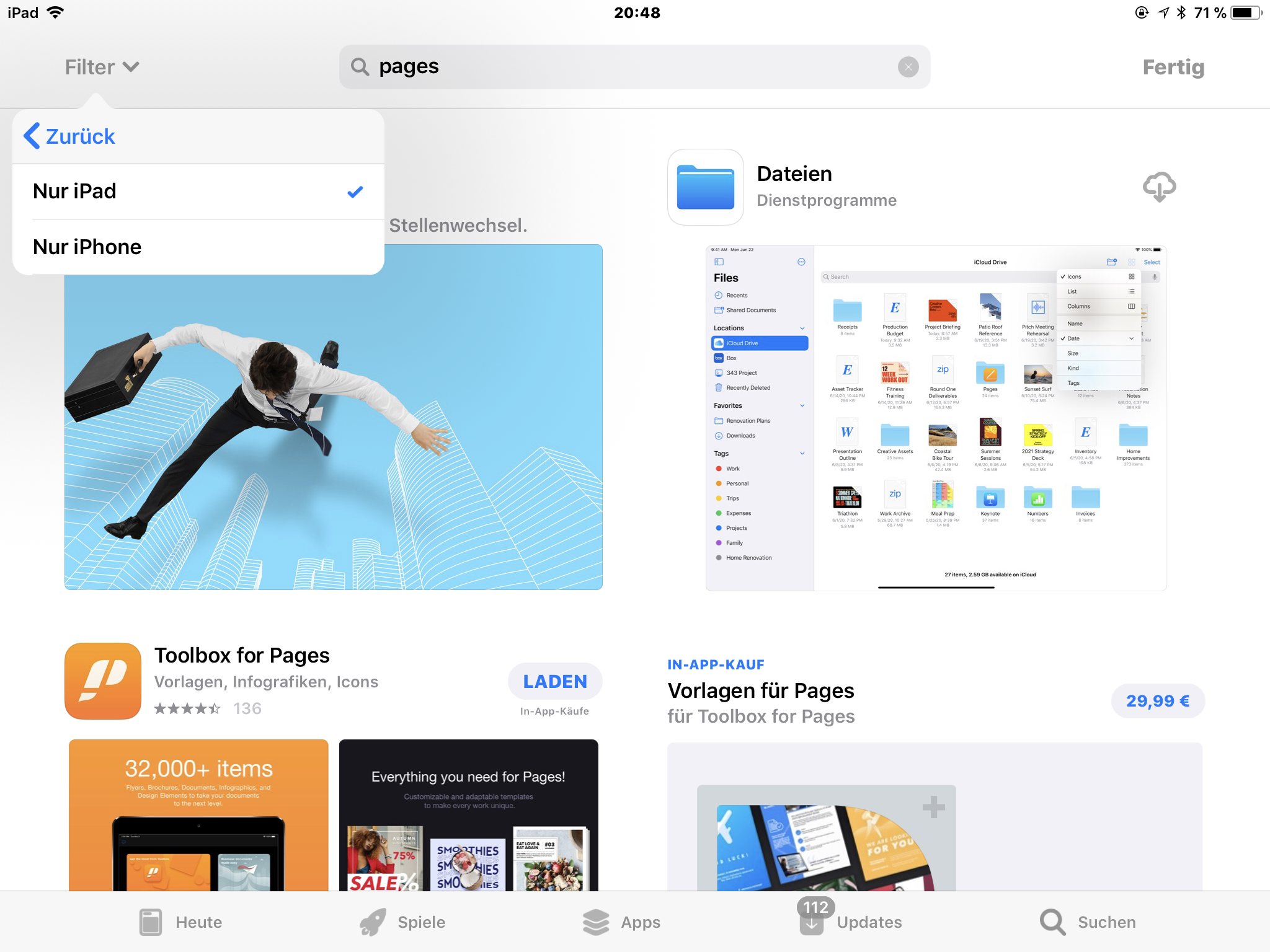 Ich kann seit heute im App-Store nicht mehr nach Apps für iPad&iPhone suchen. Es wird nur noch die Auswahl ‚nur für iPad oder nur für iPhone‘ angezeigt. Alle anderen Apps bleiben verborgen - auch die Apple eigenen wie Pages, Numbers, aber eben die meisten anderen, die ich schon habe oder eben neue zu denen ich Infos lesen will bzw. sie laden.