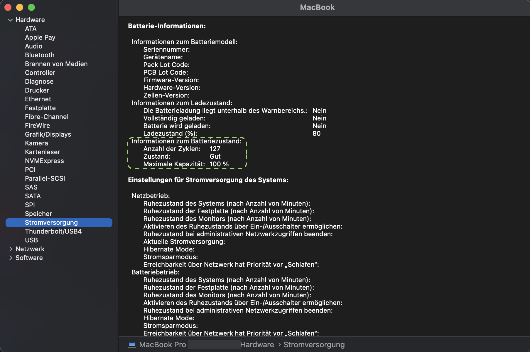 • MBP, wie alt (evtl. noch Gewährleistung, Akkukapazität muss dann aber kleiner 80% sein)?