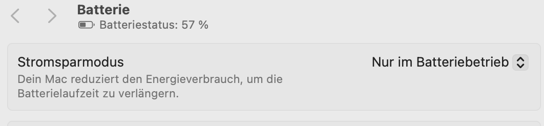 Das Gerät (MAcBook Pro mit M2 Prozessort) hängt am Netzteil und es gibt eine Batterieanzeige mit 100% und wenn man drauf klickt Energiestatus geringe Ladung.