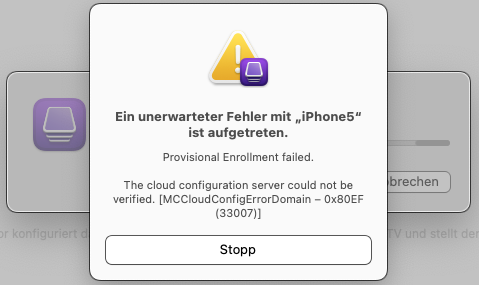 Mit Apple Configurator 2 habe ich Erfahrung. Ich habe iPads und AppleTV zu Apple School Manager hinzu gefügt. Bei dem iPhone komme ich auch bis zu dem angezeigten Fehler.