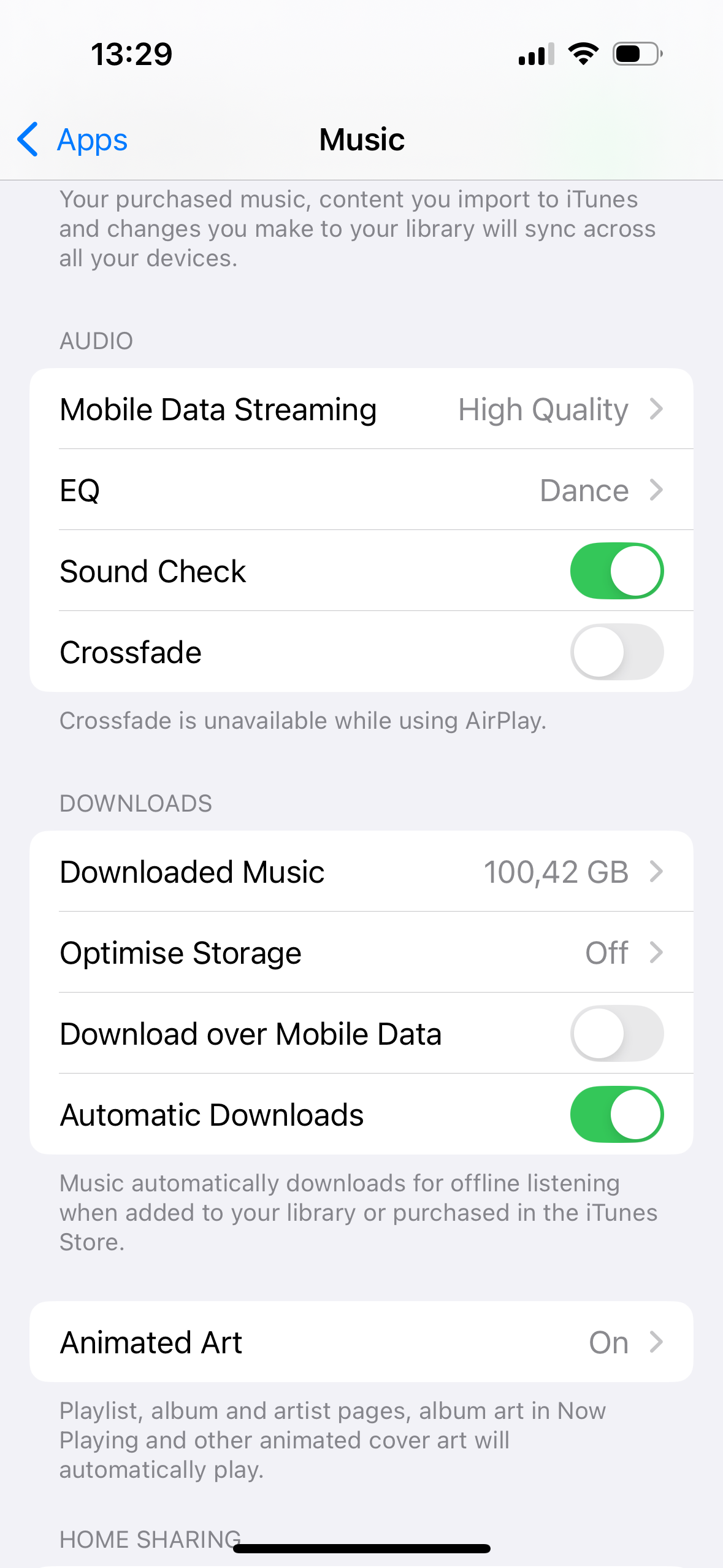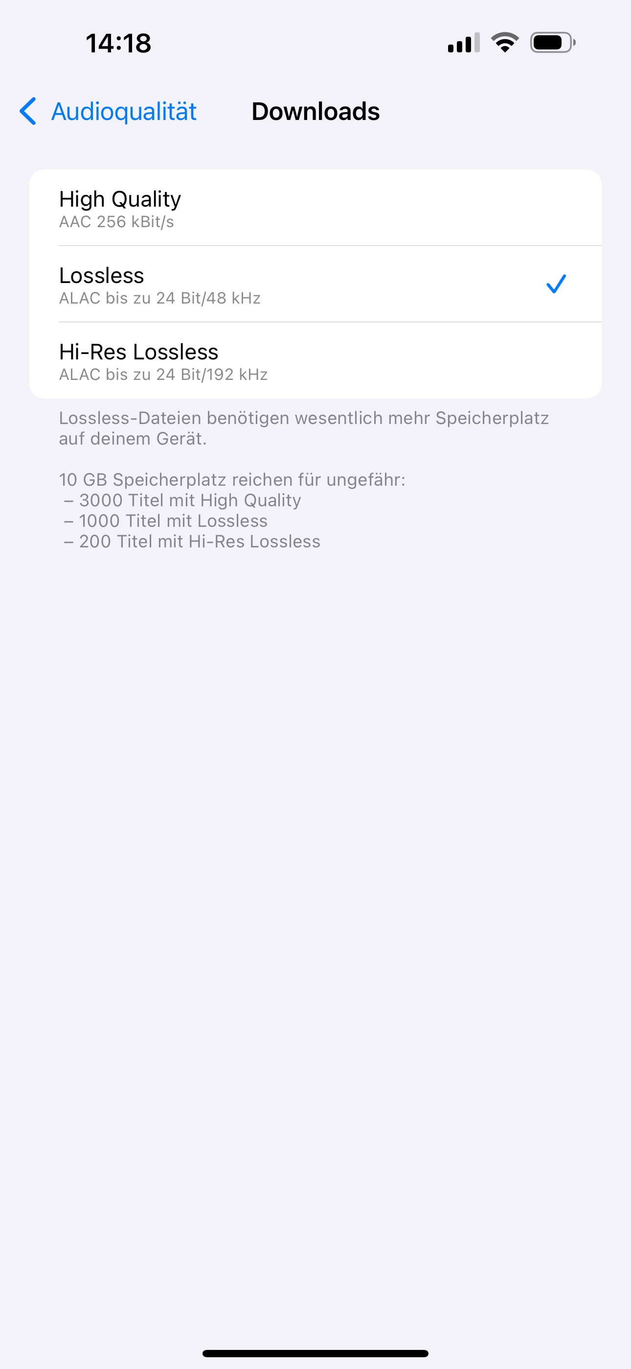 Ich nutze iTunes Match, um meine Musikbibliothek zwischen meinen Endgeräten zu synchronisieren. In Summe sind es über 10.000 Songs, die ich im ALAC-Format von CDs importiert habe oder über den iTunes Store digital gekauft habe. Mir ist aufgefallen, dass auf meinem PC die ca. 10.000 Songs ca. 200 GB Speichervolumen beanspruchen, auf meinen iPhone - obwohl (fast) alle Lieder erfolgreich heruntergeladen wurden - jedoch nur ca. 100 GB. Ich gehe davon aus, dass das an einer unterschiedlichen Musikqualität liegt und laut Internet gibt es in der Music App eine Einstellung, um Apple Lossless für Downloads anzuschalten. Diese Einstellung wird mir aber nicht angezeigt, lediglich für das Streamen von Musik kann ich "high quality" auswählen, nicht jedoch für Downloads. Mein iPhone hat 1TB Speichervolumen, von dem 600 GB noch frei sind, es ist also kein Speicherplatzproblem.