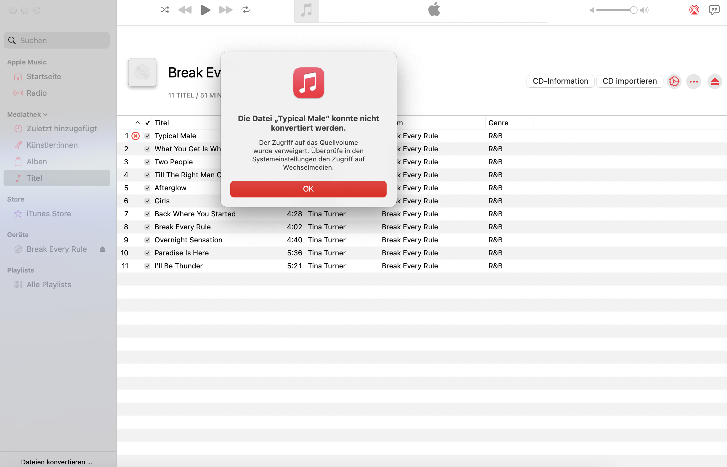 In apple musik werden die Titel von der CD angezeigt, aber wenn ich importieren drücke kommt die Meldung "keine Titel ausgewählt". Wenn ich die Titel von Hand markiere werden sie auch nicht importiert. Auch wenn ich einen Titel abspielen möchte funktioniert es nicht. Im kleinen Player erscheint Titel,Anzeigebalken mit start und Endzeit, aber kein Fortschritt im Balken und kein Ton. (Macbook pro 16"" Model 2024) Andere Programme erkennen das externe LW problemlos. Danke in´m Voraus....