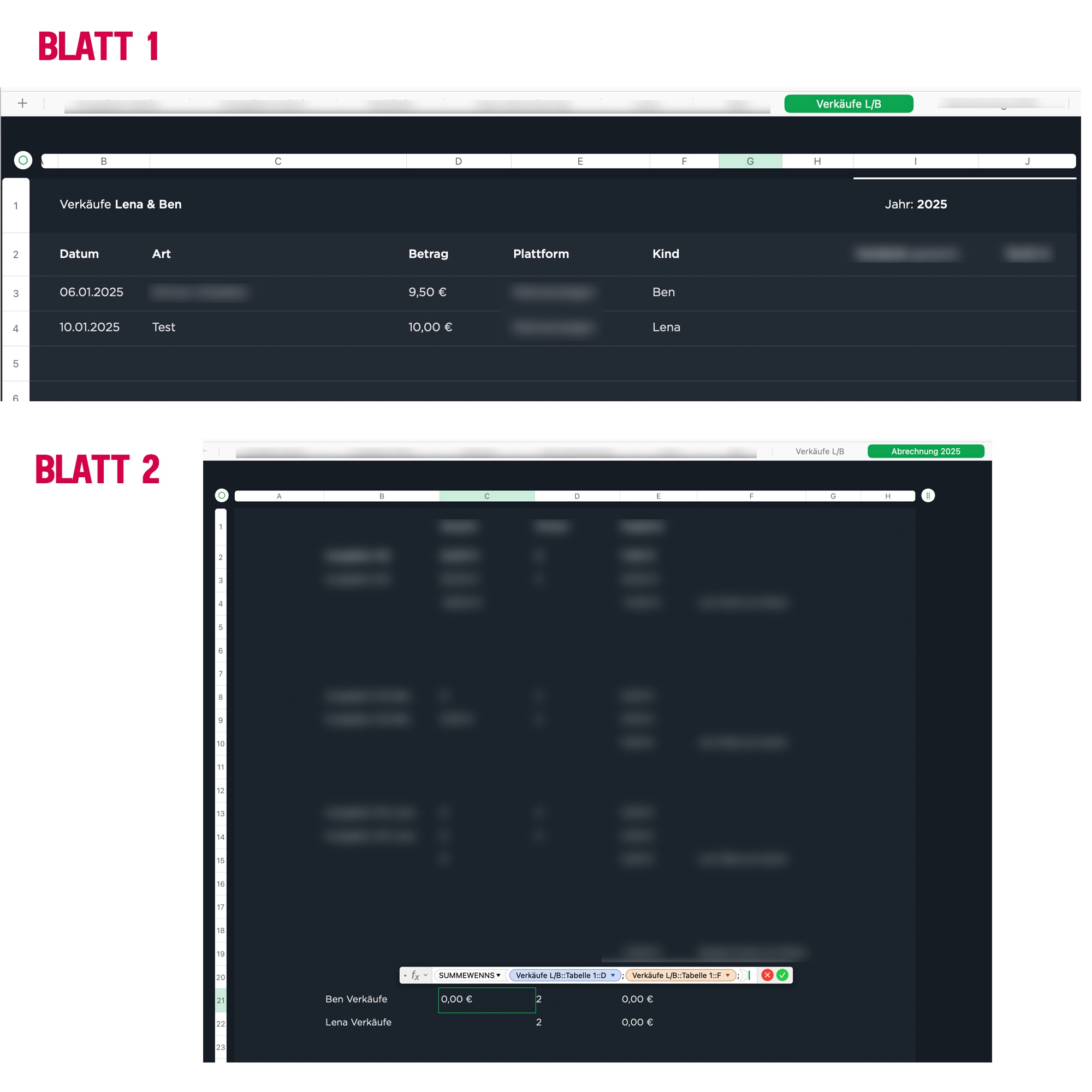 - im zeiten Tabellenblatt habe ich dann zwei Felder, in dem ich gerne die Summe hätte für 1x Lena und 1x Ben. Dort hätte ich gerne die Summe WENN eben in Tabelle 1 Lena oder Ben ausgewählt