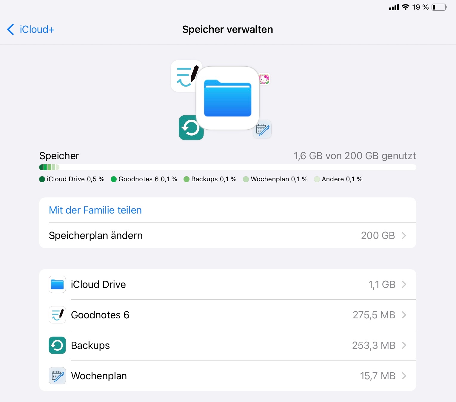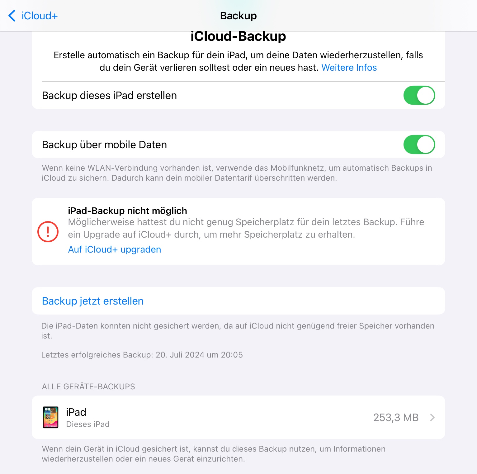 Dein iPad muss während des Backups über ausreichend Akku oder an einem Ladegerät angeschlossen sein.