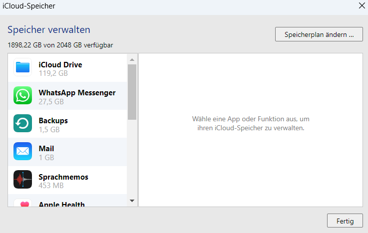 Tipp: In den iCloud-Einstellungen (unter „iPhone-Speicher verwalten“ > „iCloud“) kannst du genau sehen, welche App wie viel Speicher belegt. Vielleicht liegt die Ursache für die 119,2 GB dort.