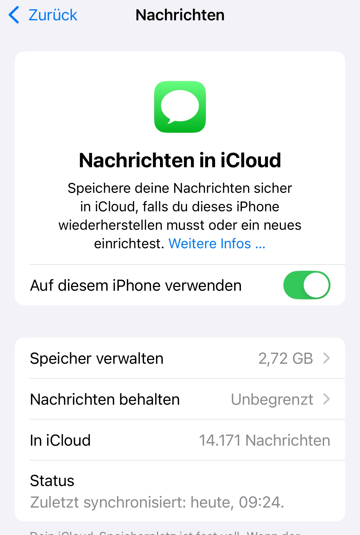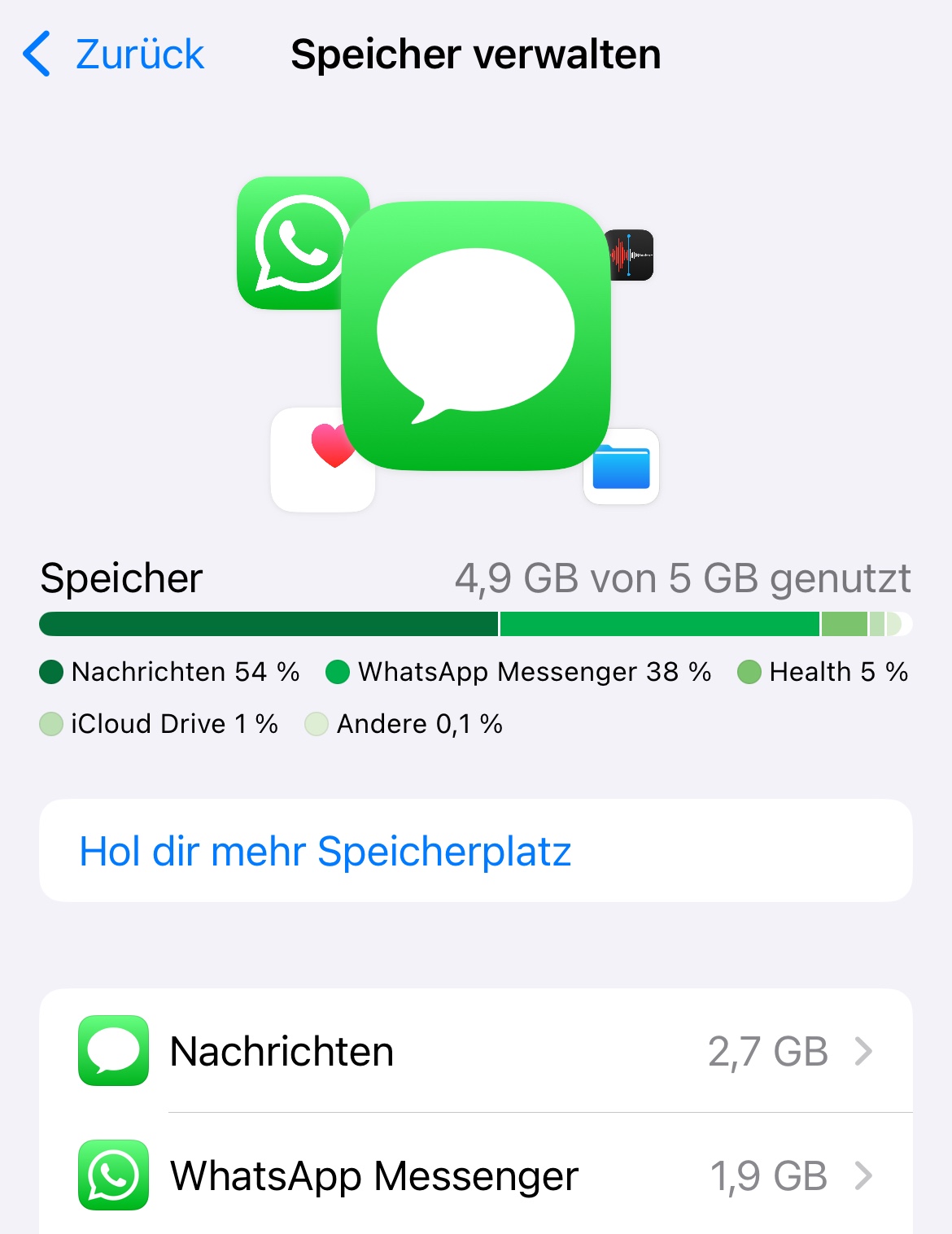 ich nutze die kostenlose Apple ICloud 5 GB und es wird mir seit Wochen angezeigt, dass dieser voll ist. Insbesondere wird angezeigt, dass die App Nachrichten 2,7 GB beansprucht obwohl wenn man detailliert in die App geht nur 240 MB beansprucht wird.