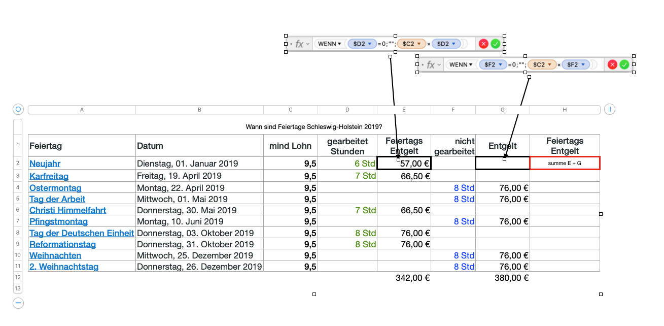 In der Tabelle soll errechnet werden wieviel Entgelt ich bei Feiertagsarbeit erhalten würde.