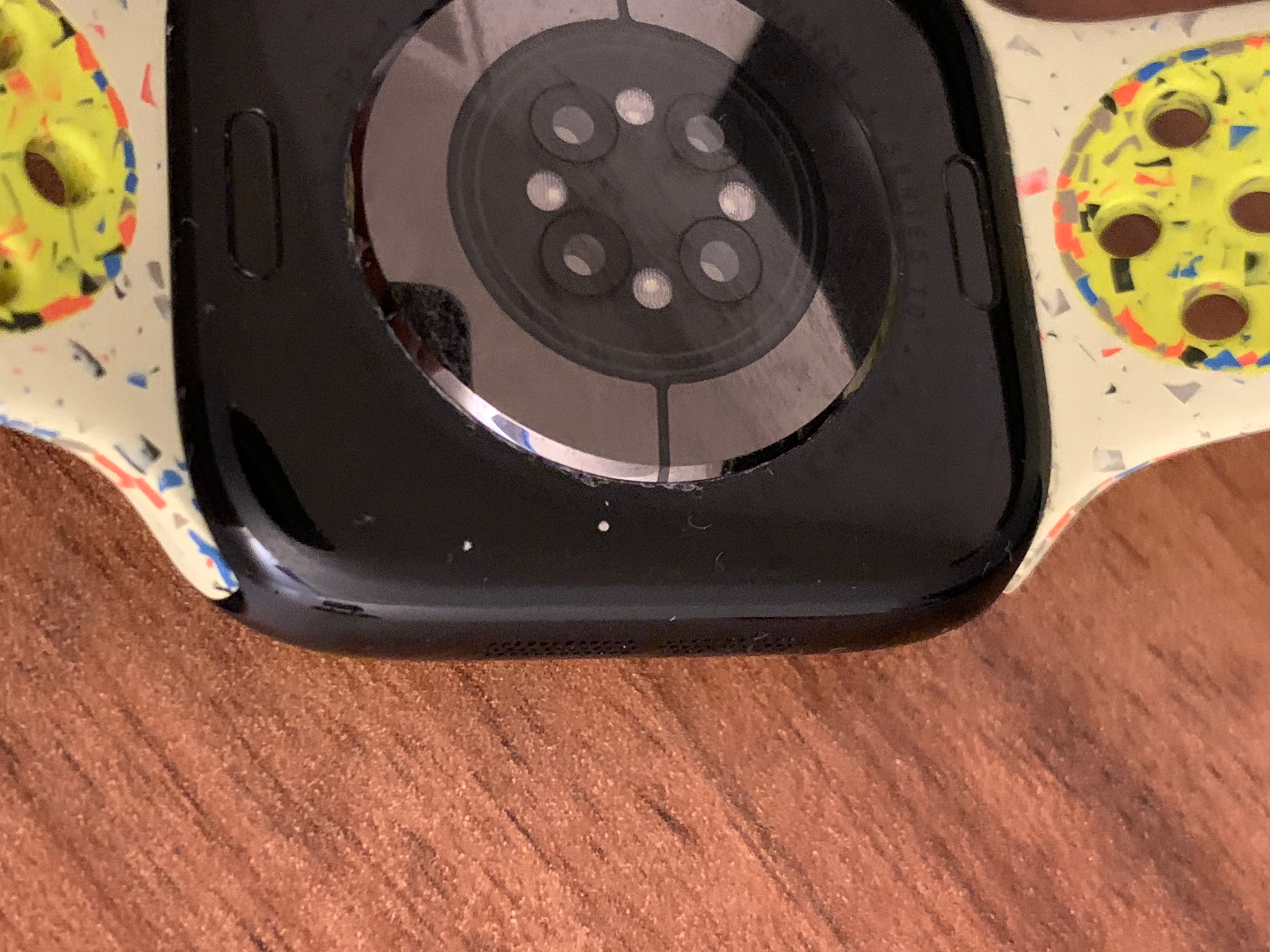 recently I was cleaning my watch and noticed two dots on the inside besides the glas sensor. I used my finger nail to remove two 'pimples' stuck on the housing, which now show bare aluminium. I think this was no dirt, the pimples were the coating of the aluminium. Is this supposed to happen at some point in life of the apple watch? I expected this to be an eloxide not a coating.