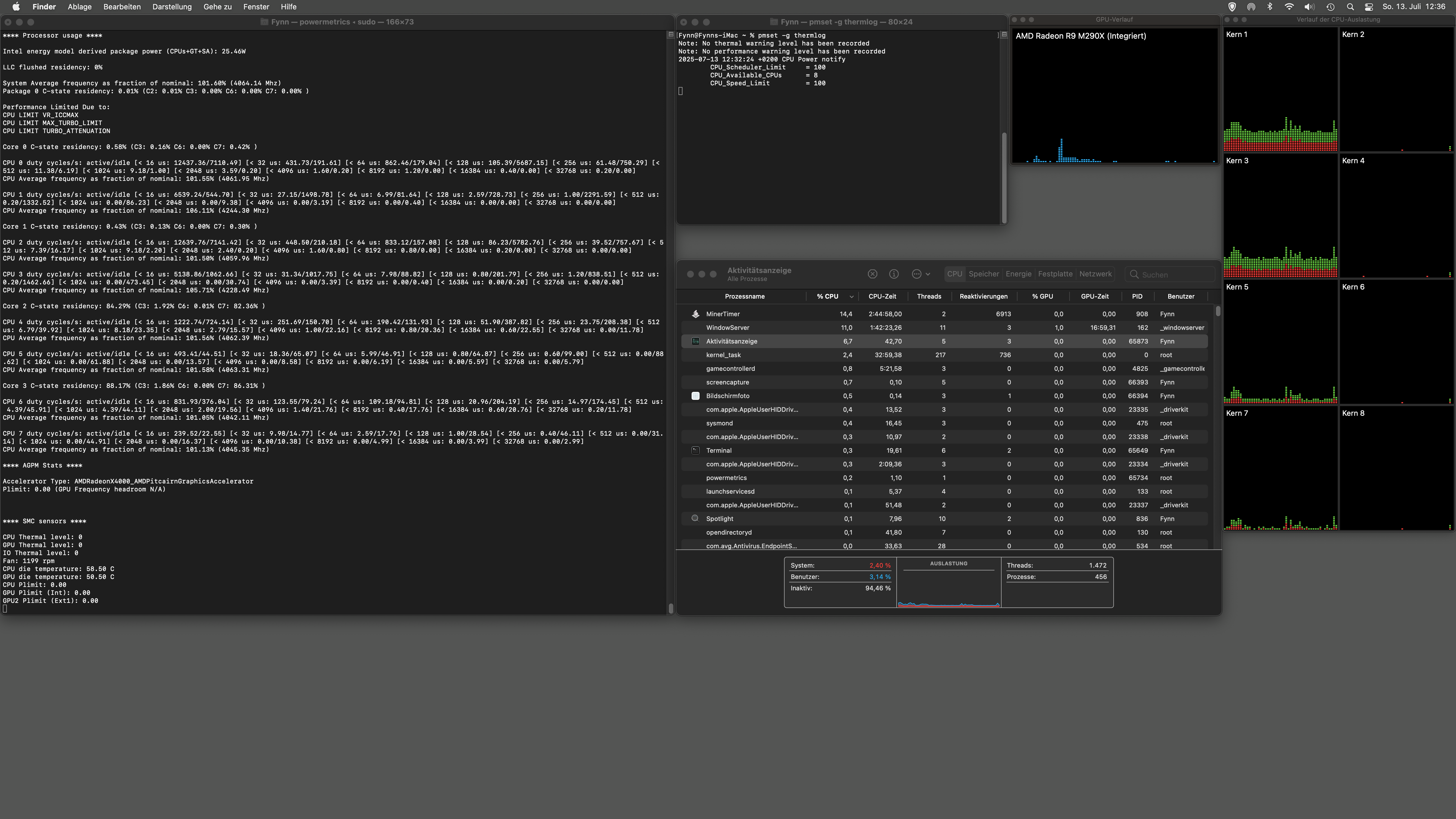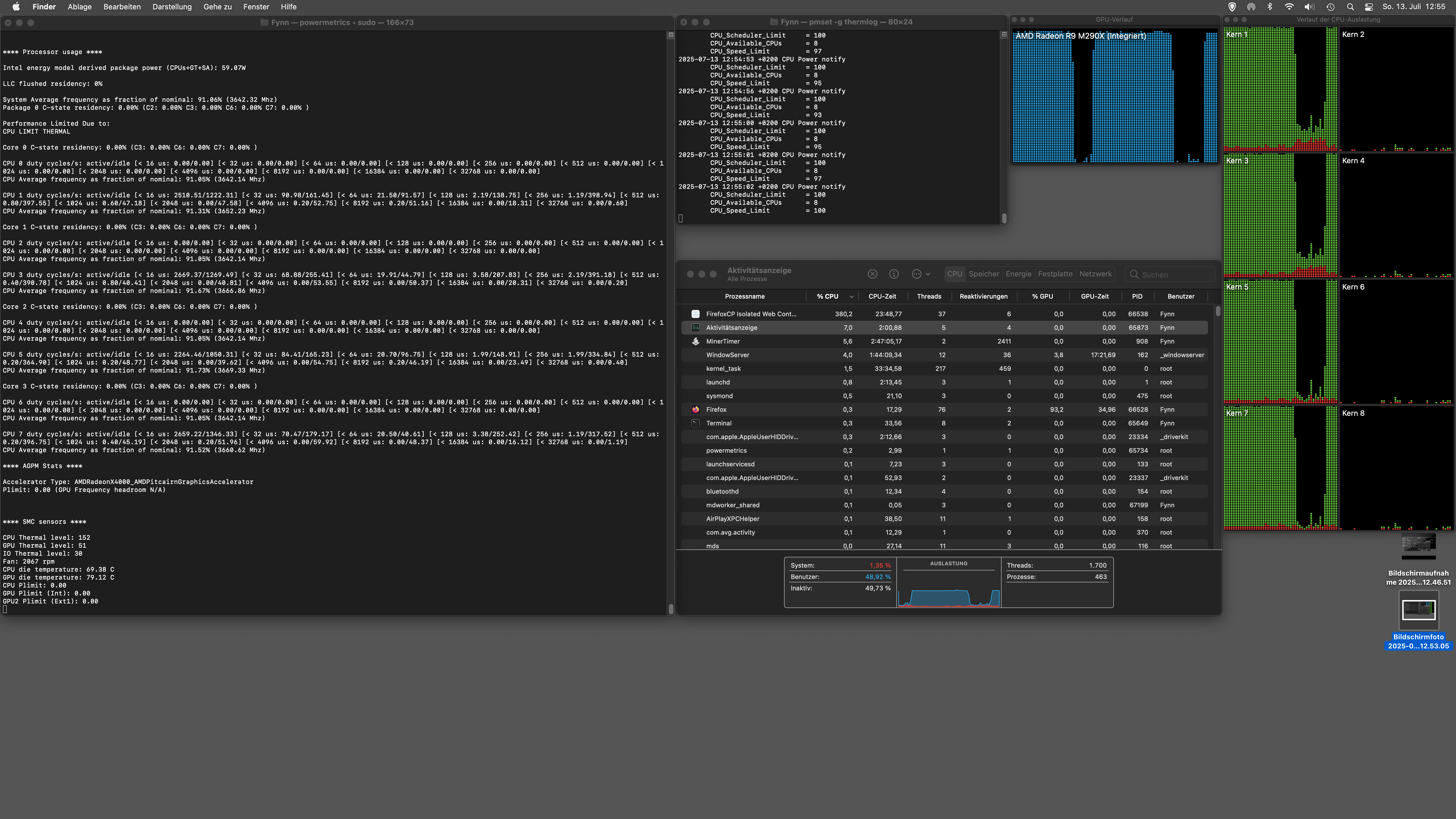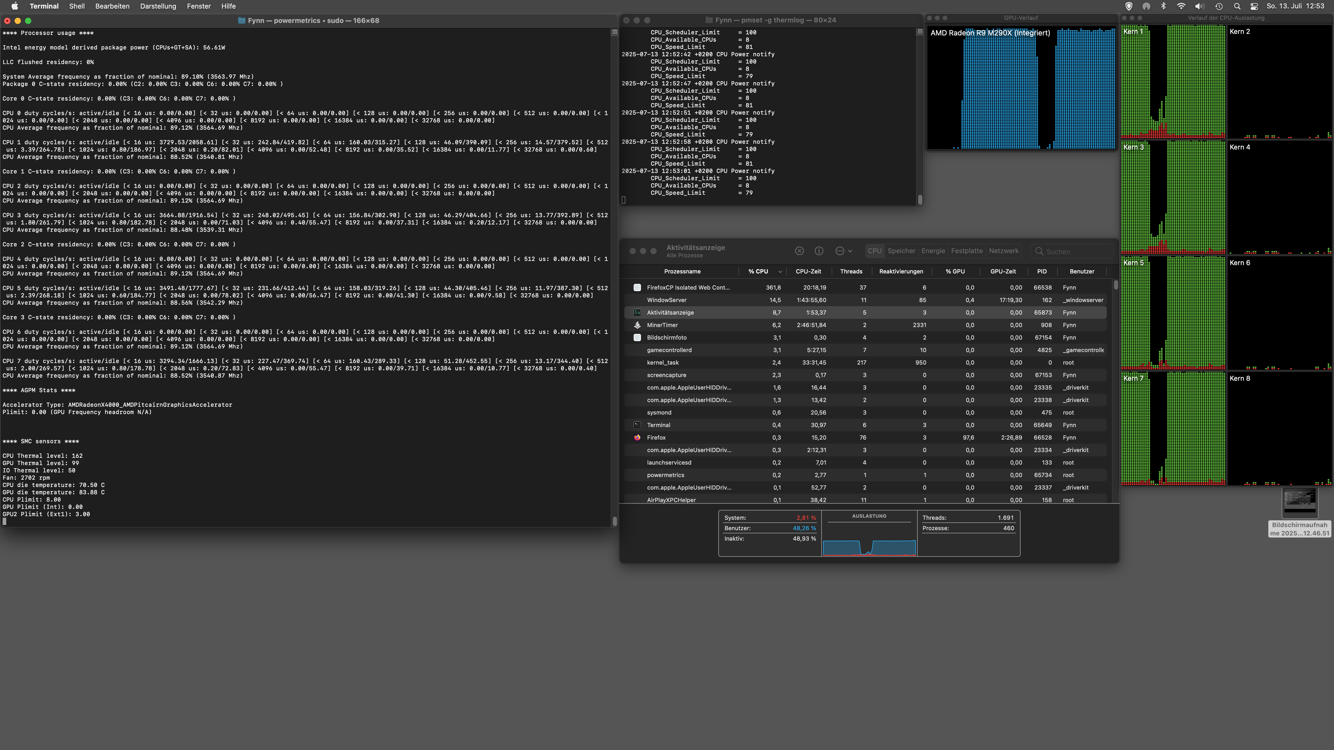 Im lade jegliche relevante Berichte aus dem Systembericht mit hoch und auch ein Video (+ Screenshots) wo ich die CPU & GPU belaste. In dem Video ist auch zu sehen, was die Powermetrics-Anwendung, als auch der Thermlog währenddessen ausgibt.