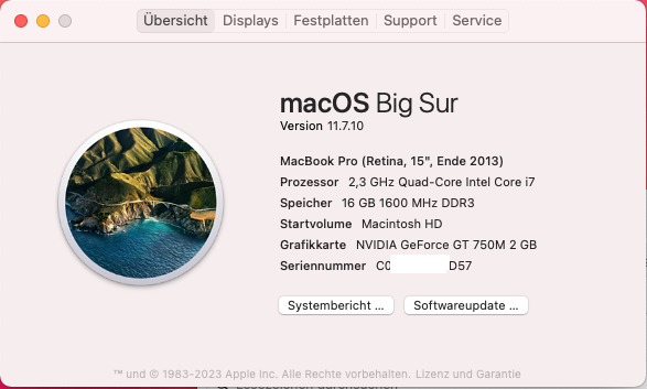 MacBook Pro (Retina,1 15", Ende 2013) macOS Big Sur, Version 11.7.10