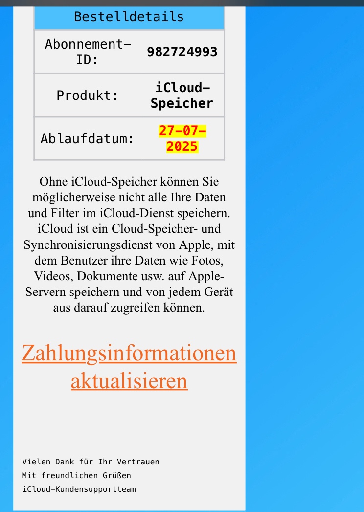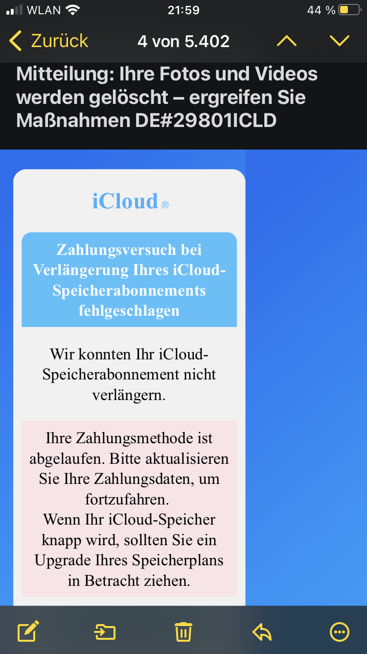 Zahlungsverzug bei Verlängerung iCloud Speicherabonnemts fehlgeschlagen