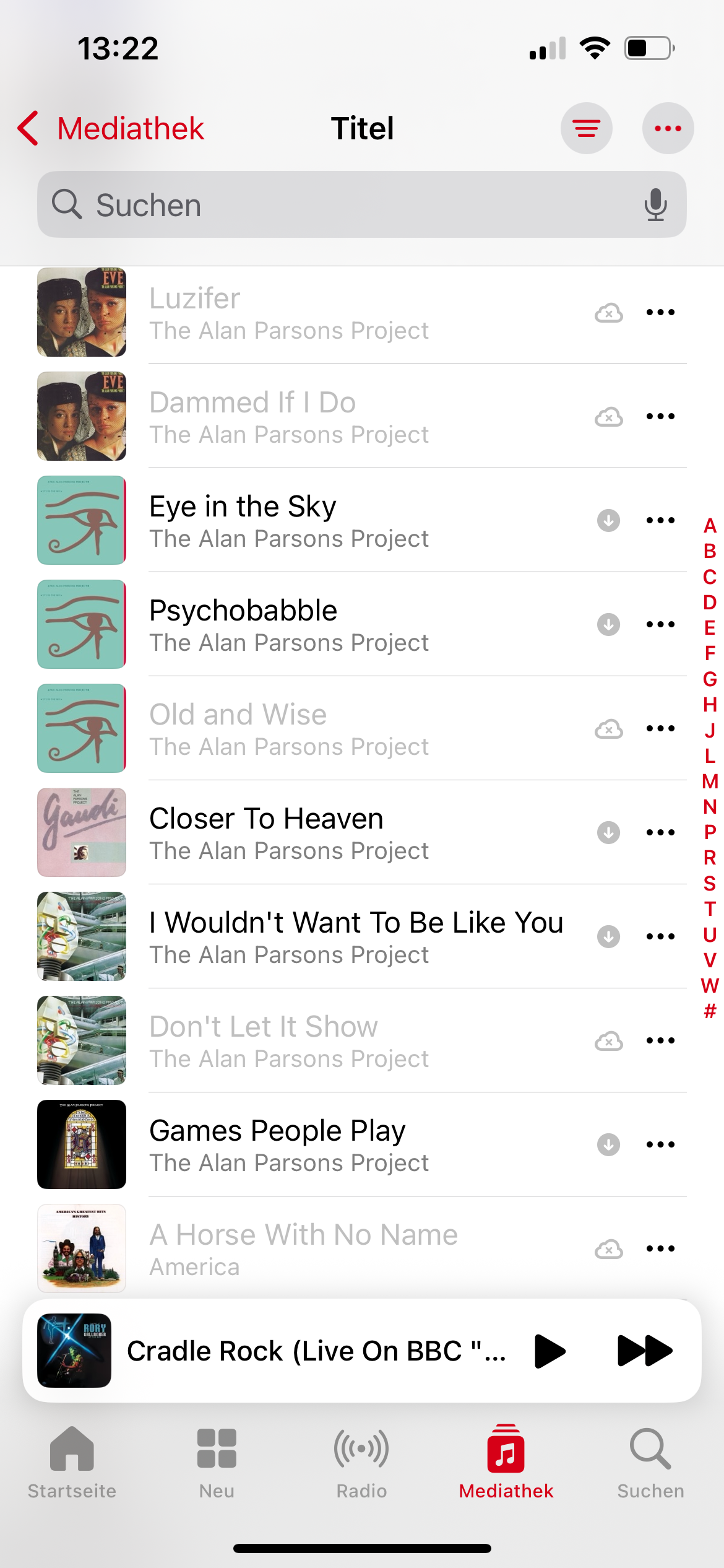 Nun habe ich nach dem Kauf eines neuen iPhones ein Apple Music Abo zugelegt und versucht, die Mediathek auf das neue iPhone zu synchronisieren. Klappt auch hervorragend. Jeder Titel, Bandname und die meisten Cover sind auf dem neuen Handy angekommen. Allerdings 2/3 der der eigentlichen Audiodateien nicht (siehe Foto ausgegraute Titel).
