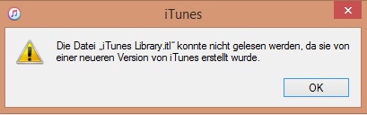 ich habe itunes für windows 8.1 heruntergeladen und installiert, aber leider lässt sich das Programm nicht öffnen. Ich bekomme immer die Fehlermeldung: Die Datei "iTunes Library.itl" konnte nicht gelesen werden, da sie von einer neuen Version von itunes erstellt wurde.