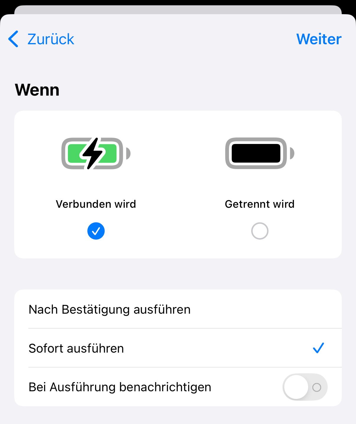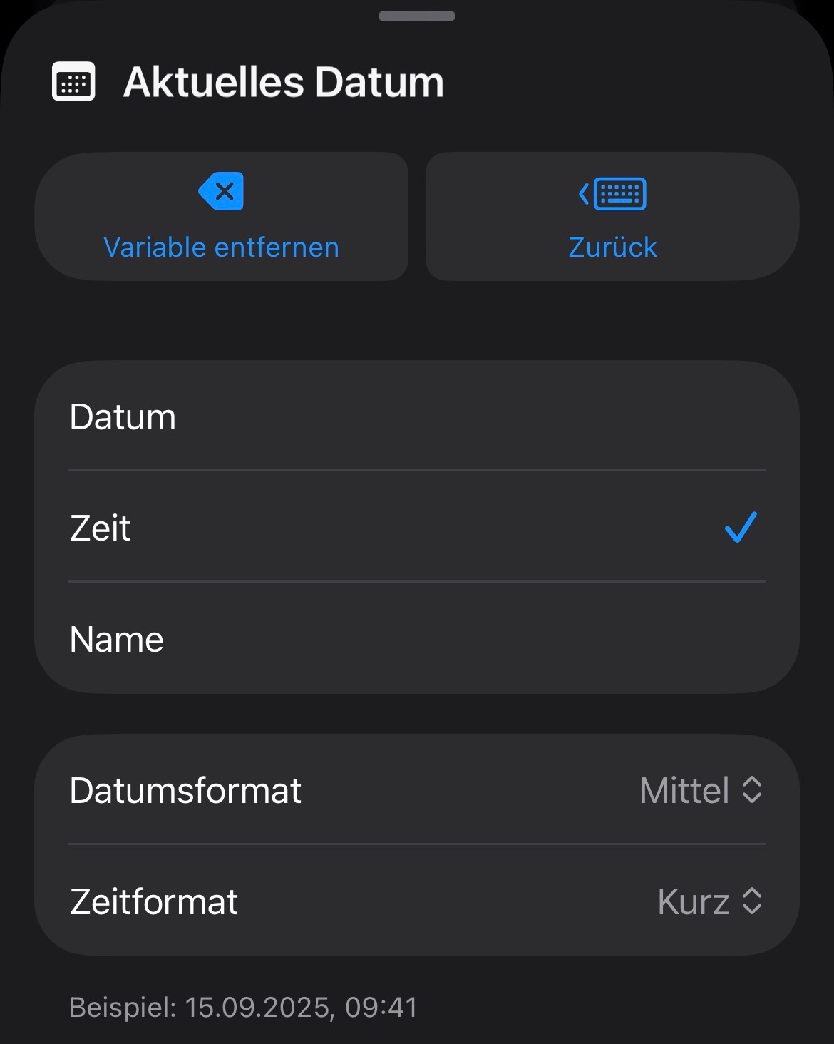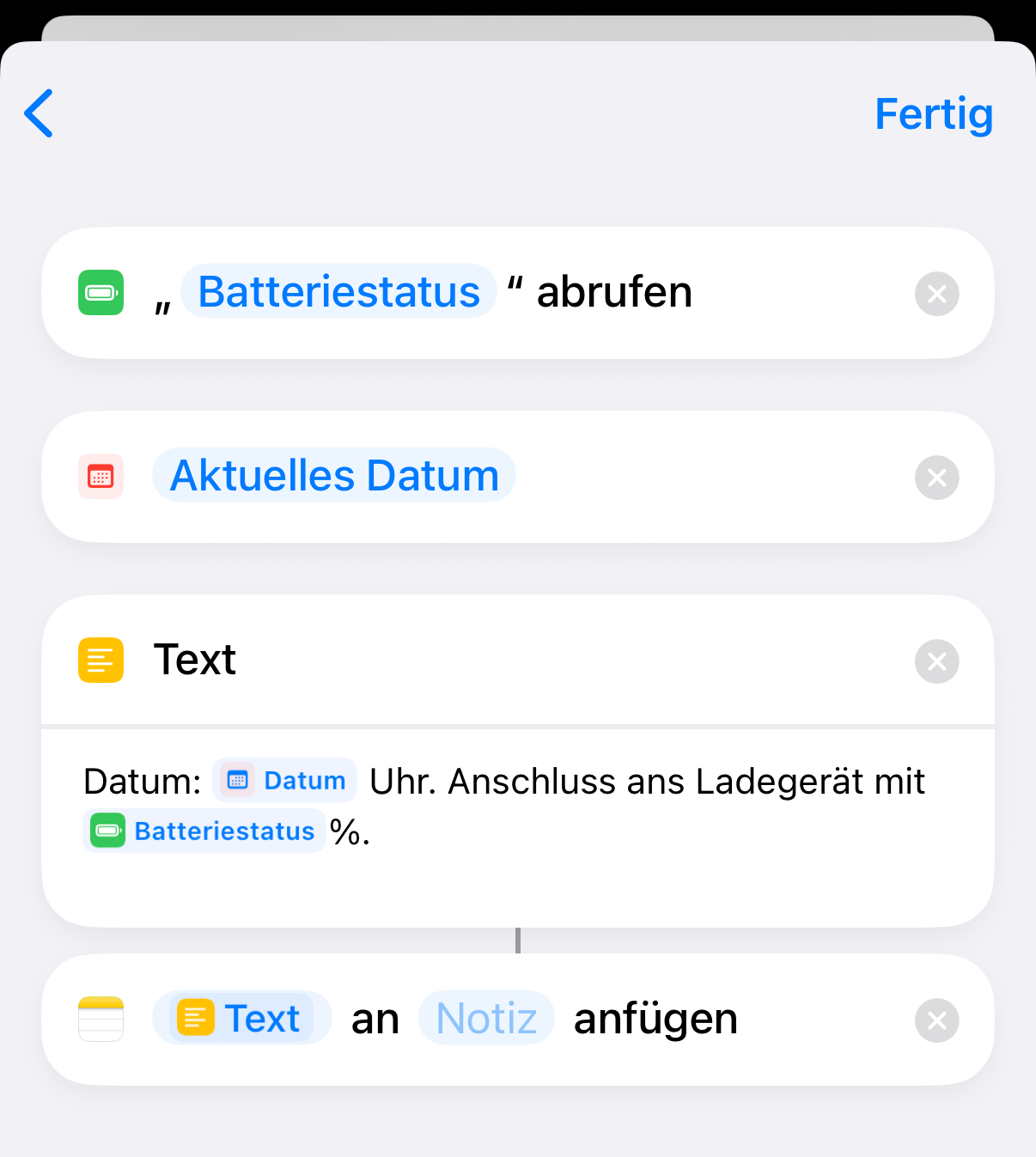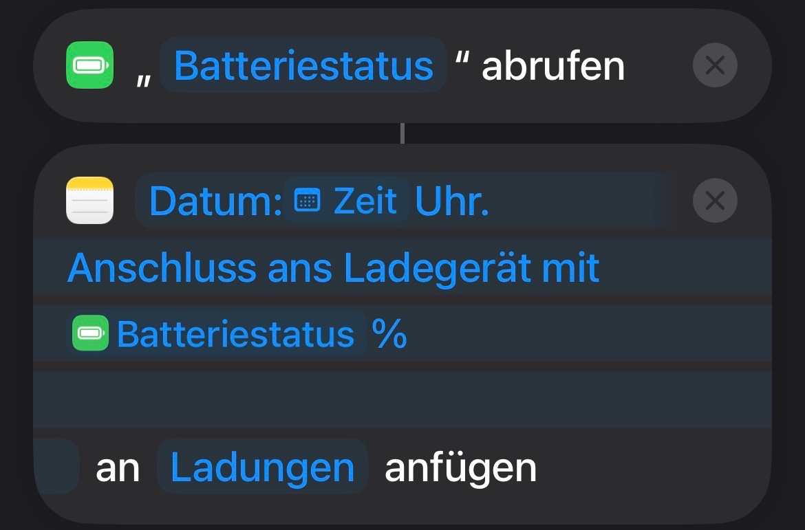 Ich habe ein Problem mit einer Automation (in der App Kurzbefehle), welche die Ladezyklen eines IPhones tracken soll. Ich arbeite dafür mit einer Variable, welche das aktuelle Datum und die Uhrzeit abrufen soll, welche dann gemeinsam mit dem Batteriestatus in einer Notiz festgehalten werden.