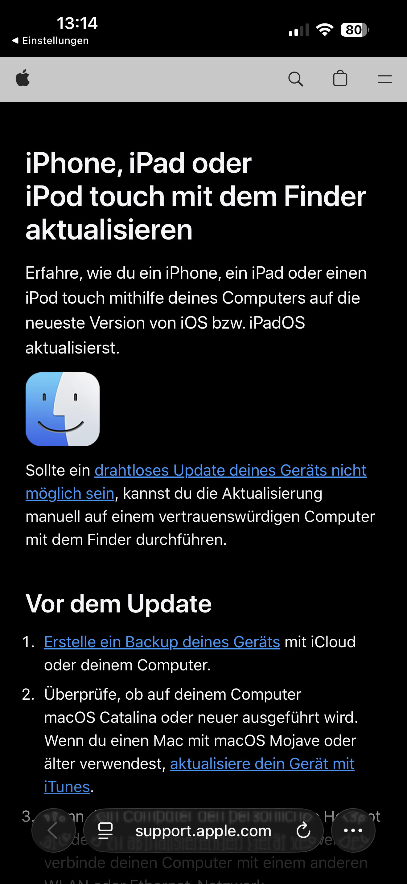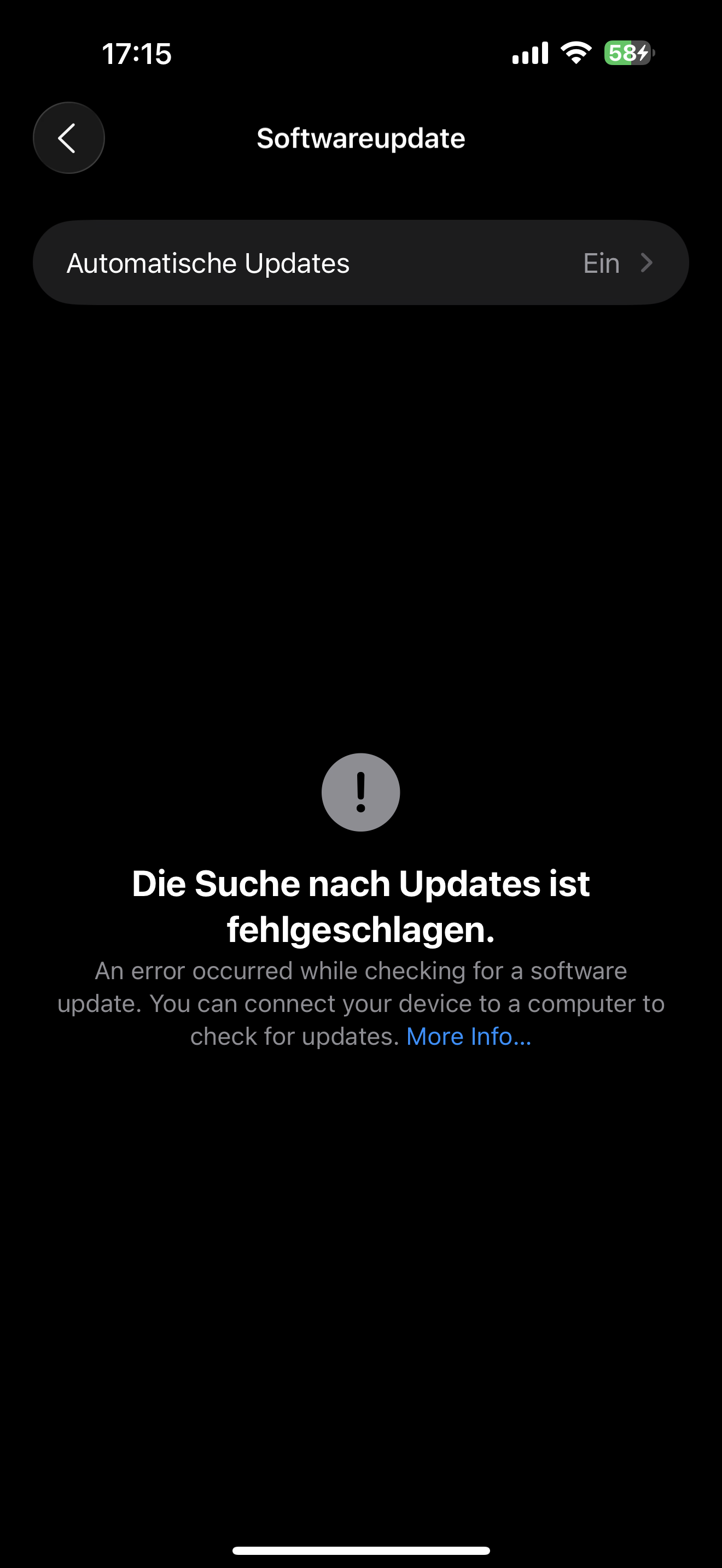 an meinem iPad oder Apple Watch funktioniert das kabellose Update ohne Probleme. Nur am iPhone findet er keine Update, benachrichtigt mich dementsprechend auch nicht wenn es welche gibt, aber ich weis ja das es welche gibt nur steht immer wieder die selbe Meldung dort und es hängt sich auch sofort die Einstellungen App auf. Und ja ich weis ich kann das auch am PC über iTunes machen, aber es nervt mich einfach jedes Mal das am PC machen zu müssen und nicht mal eine Benachrichtigung für ein neues Update zu bekommen, ich denke es muss irgend ein Einstellungs Problem sein oder ähnliches.