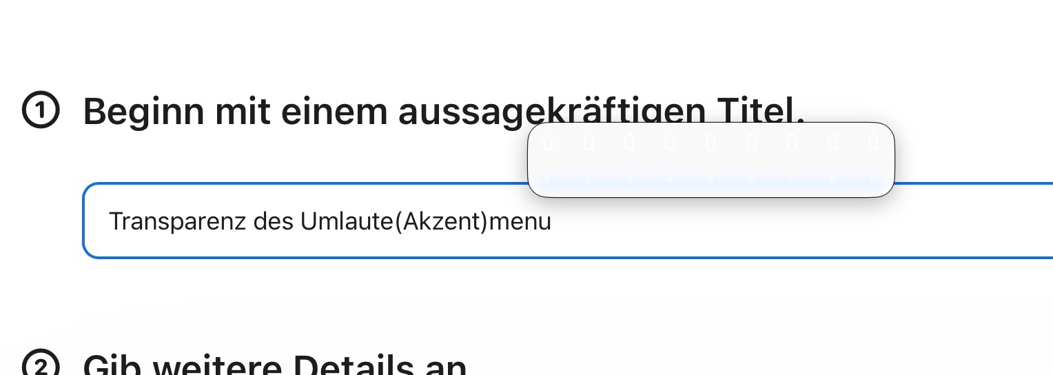 Problem: nach Update auf macOS Tahoe tritt folgendes Problem auf: beim Aufrufen des Umlautemenüs durch längeren Tastendruck erscheint das Umlautemenü transparent. Die Umlaute sind vorhanden. Aber sie erscheinen weiß auf transparent. Nur durch sehr genaues Hinsehen ist erkennbar, wo welcher Akzent steht. Die Eigenart tritt zum Beispiel nicht in der Befehlszeile (Safari) oder in Mail oder in sozialen Medien (Chat/Nachrichten} oder Word/Excel auf. Dort sind die Umlaute/Akzente nach langem Tastendruck im Menü deutlich zu sehen.