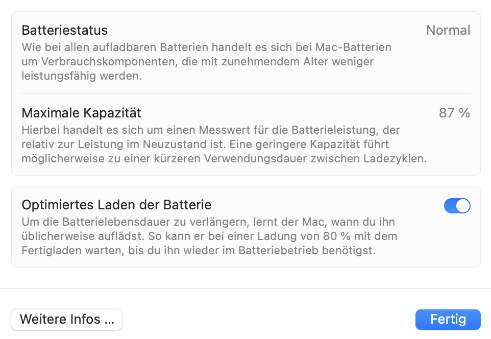 Während also mein Akku stetig an Kapazität verliert, zeigt mein MacBook in den Einstellungen munter weiter 87% SOH an. (Screenshot 2)