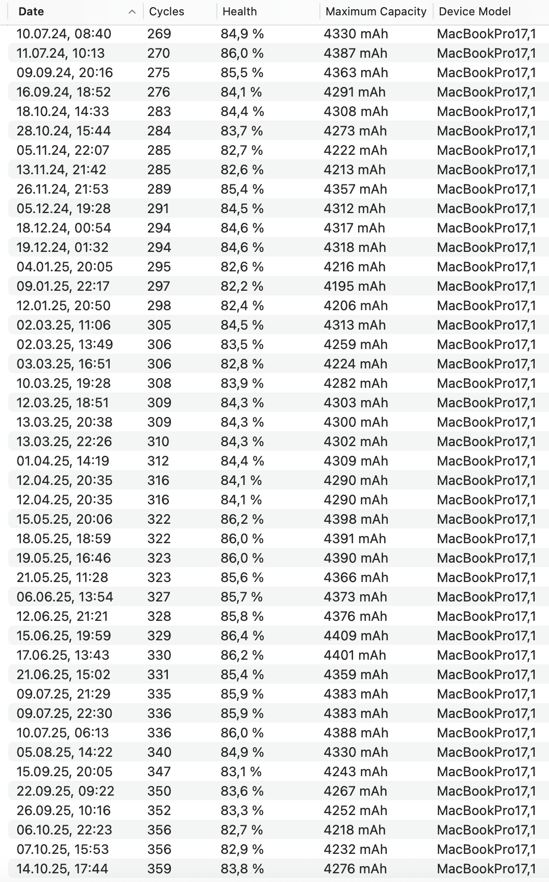 Ich habe coconutBattery dauerhaft auf meinem MacBook installiert, da ich damit andere iOS Geräte auslese. In Folge dessen hat coconutBattery meine Batterie, seitdem ich mein MacBook habe, geloggt (siehe Screenshot 1, nicht alle Daten aus Platzgründen ersichtlich).