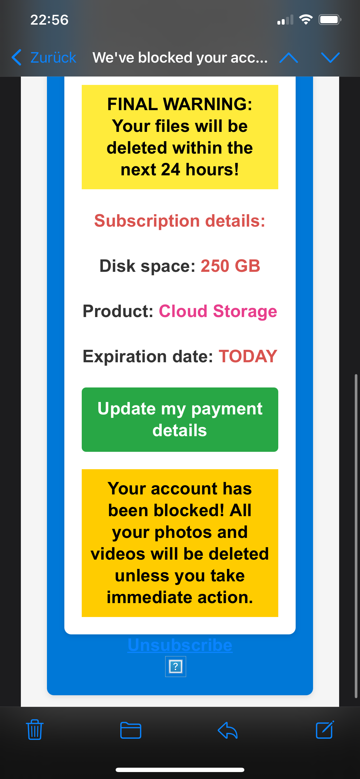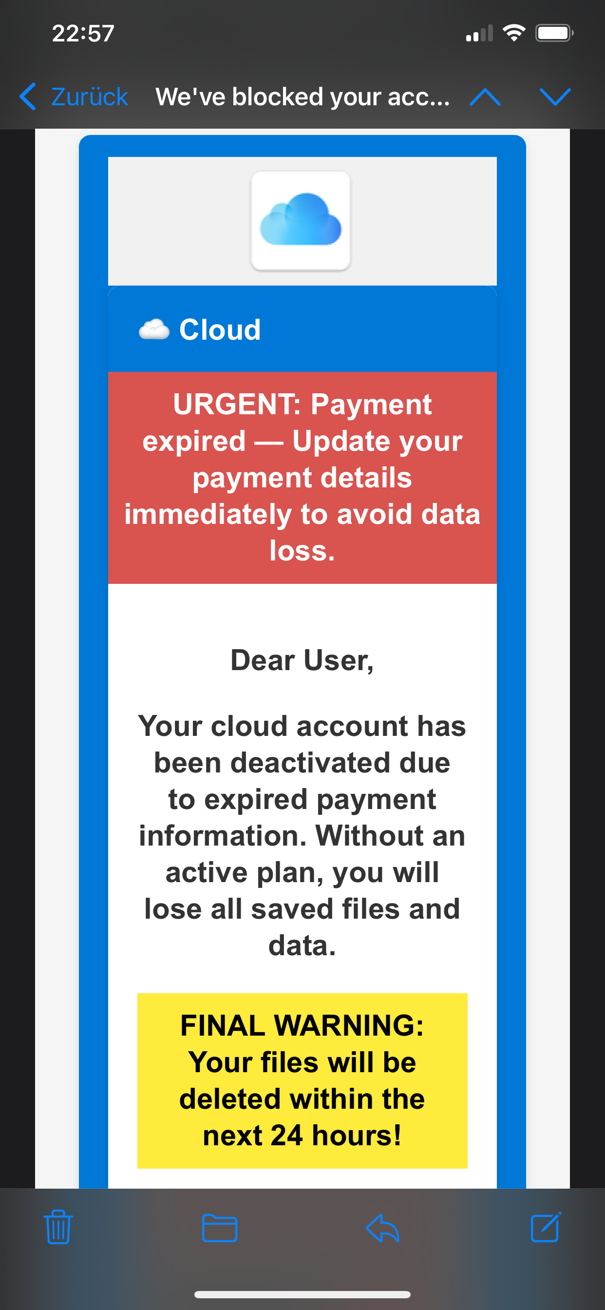 Also für mich sieht das sehr nach SPAM aus: bunte, knallig, auffällige Farben - so würde Apple das nicht schreiben und dann noch ”Cloud“ statt iCloud - mal sehen was die anderen dazu sagen