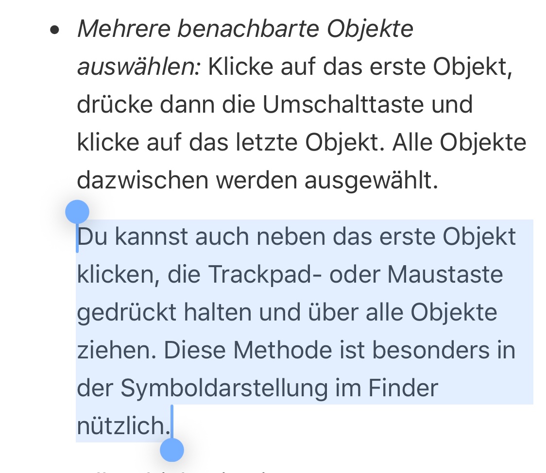 "Mehrere benachbarte Objekte auswählen: Klicke auf das erste Objekt, drücke dann die Umschalttaste und klicke auf das letzte Objekt. Alle Objekte dazwischen werden ausgewählt.",
