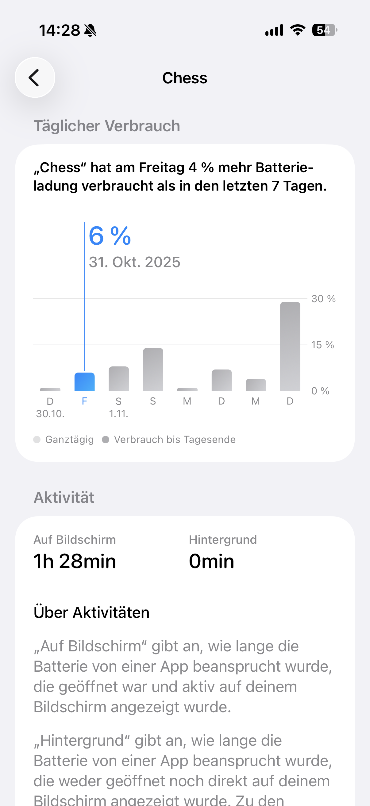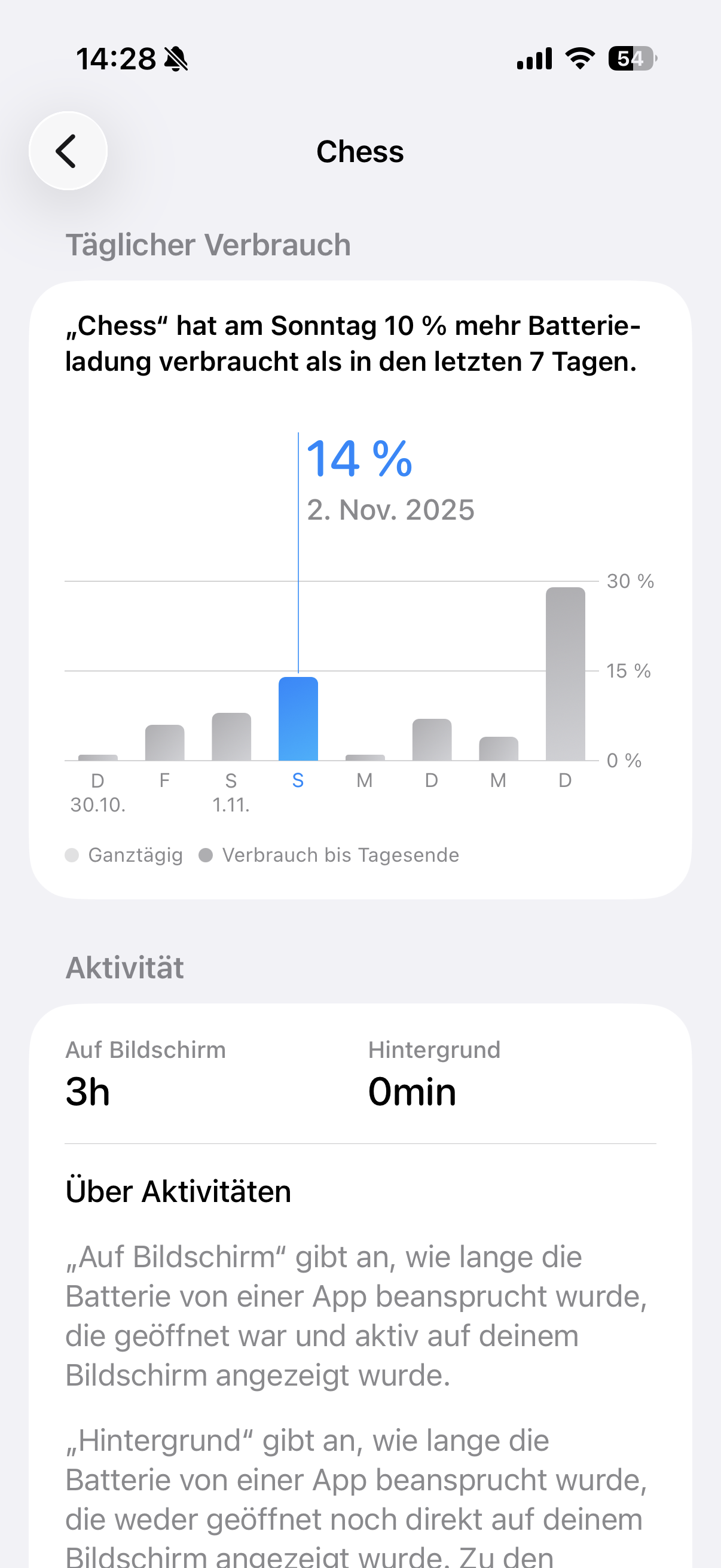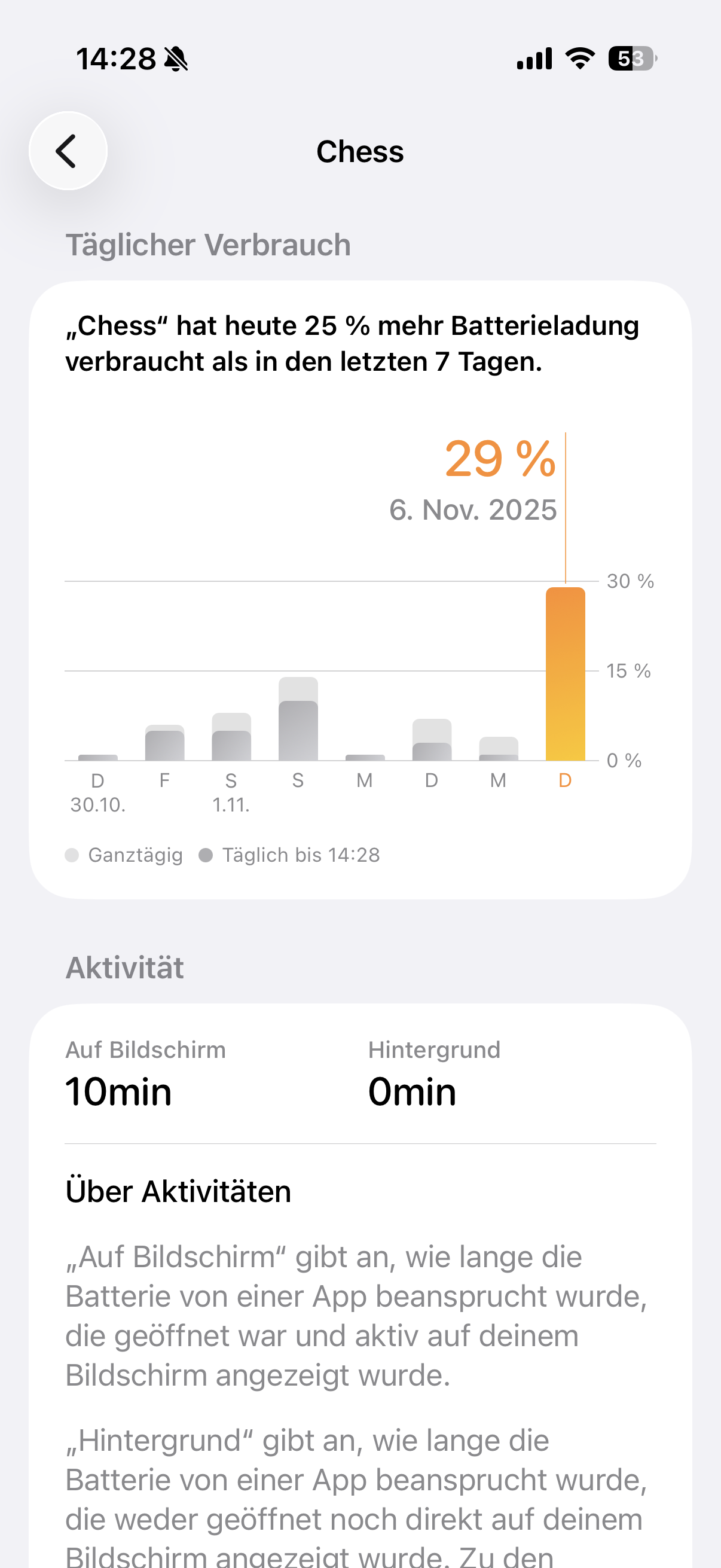 und es is nicht immer so es verhält sich eigenartig zb hier vom der Schach App habe heute nur 10 min gespielt Handy wird warm und 30% verloren das is absolut abnormal zum vergleich die Tage davor wo ich viel mehr gespielt habe habe viel weniger verbraucht habe das selbe mit Instagram usw