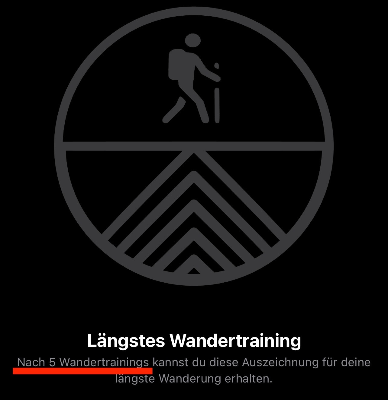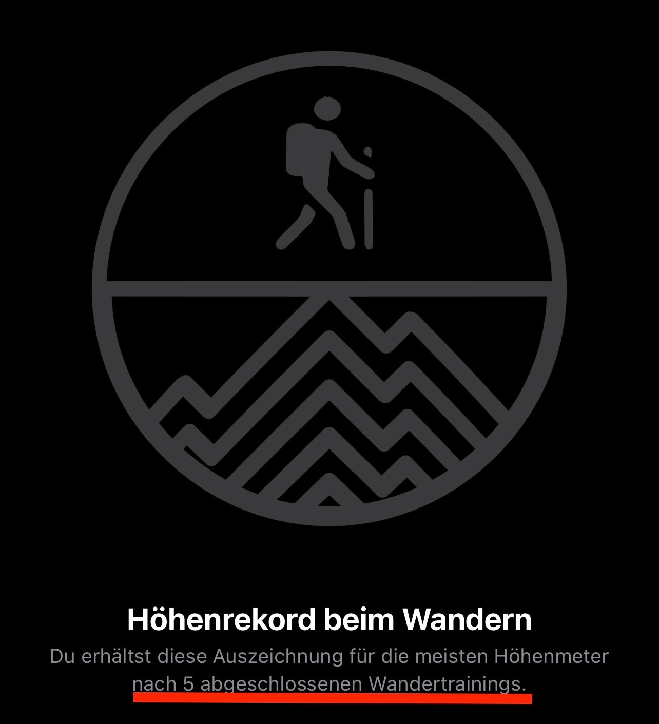 ich habe meine Wanderungen anfangs auf einer Apple Watch Series 9 aufgezeichnet und dabei auch Höhenrekorde und lange Wanderungen absolviert. Diese Trainings werden korrekt in der Fitness-App angezeigt, allerdings habe ich die dazugehörigen Auszeichnungen („Höhenrekord beim Wandern“ und „Längstes Wandertraining“) nie erhalten. Eigentlich müssten diese ja schon bei der ersten Wanderung freigeschaltet werden.