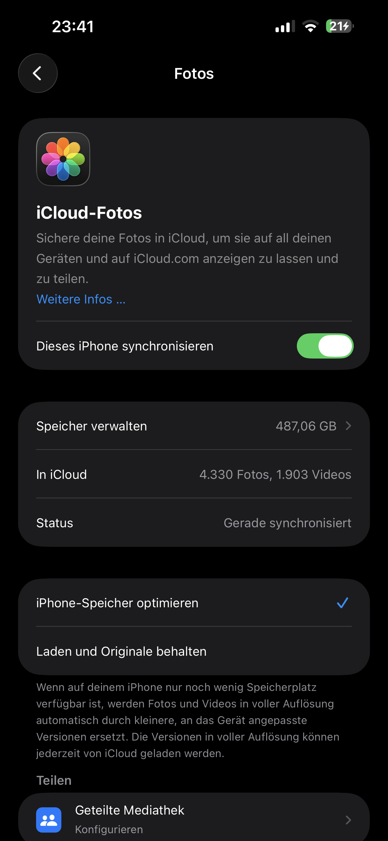 Schau bitte einmal in die Einstellungen für iCloud-Fotos: Einstellungen > Apple-Account (dein Name oben) > iCloud > Fotos. Dort sollte „Dieses iPhone synchronisieren“ aktiviert und „iPhone-Speicher optimieren“ eingeschaltet sein. Unter „Status prüfen“ siehst du außerdem, wann deine Fotomediathek zuletzt mit iCloud synchronisiert wurde und ob die Synchronisierung eventuell angehalten ist.