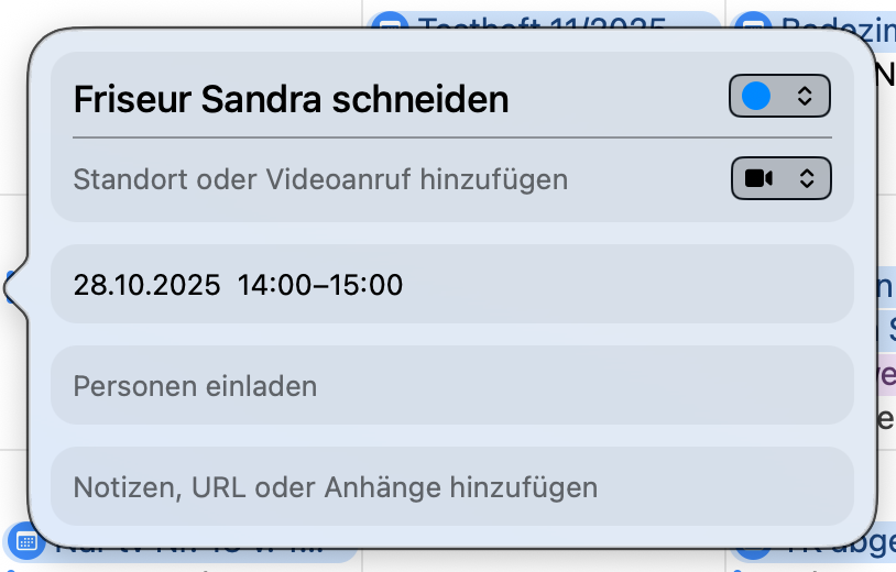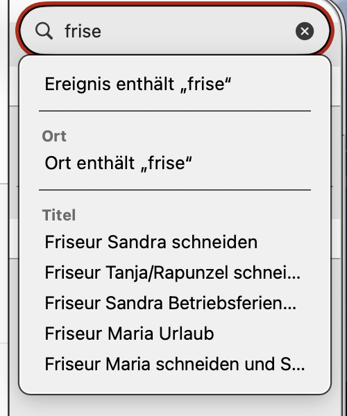 Wenn meine Frau auf dem jeweiligen Gerät in der App: „Kalender“ einen Suchbegriff einträgt, um z.B. einen Friseurtermin in der Vergangenheit zu suchen, wird unter „Titel“ einige Vorschläge angezeigt.