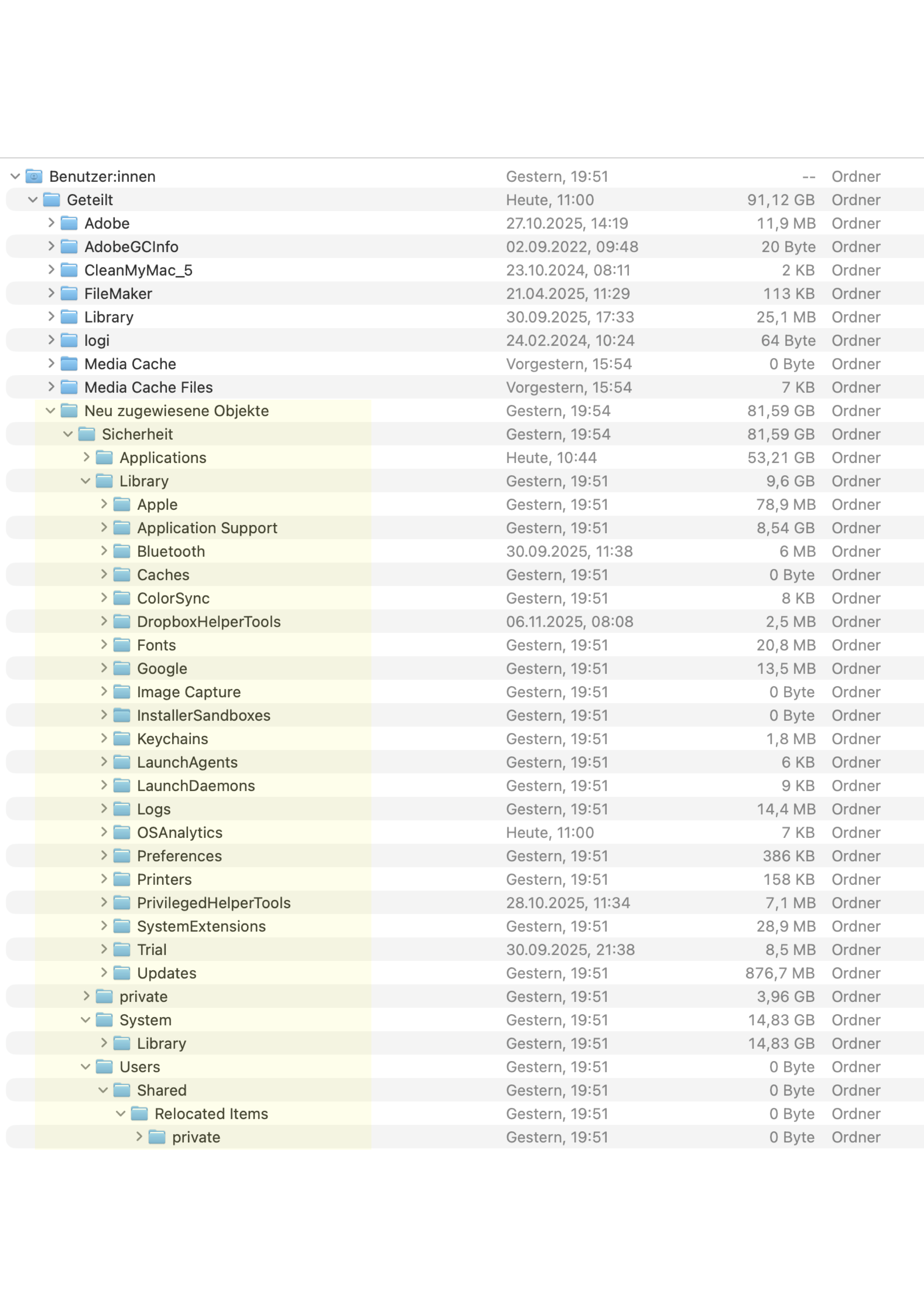 Nach dem Update auf macOS Tahoe 26.0 auf meinem MacBook Air (M2, 2022) musste ich feststellen, dass alle Programme - außer denen von Apple - scheinbar nicht mehr vorhanden waren. Tatsächlich hat das Update den Ordner Applications mit allen Drittprogrammen sowie die System-Library und weitere Systemordner in einen Ordner "Neu zugewiesene Objekte" in den Benutzerordner "Geteilt" verschoben (s. Anhang). Außerdem waren verschiedene Systemeinstellungen wie z. B. die Bildschirmauflösung verstellt und alle Anmeldeobjekte entfernt. Es hat mich einige Stunden gekostet, alles wieder herzustellen und teilweise Programme komplett neu zu installieren. Das gleiche ist dann beim Update auf 26.01 und vor kurzem auf 26.1 passiert. Was kann ich tun, damit dies beim Update auf 26.2 nicht wieder passiert?