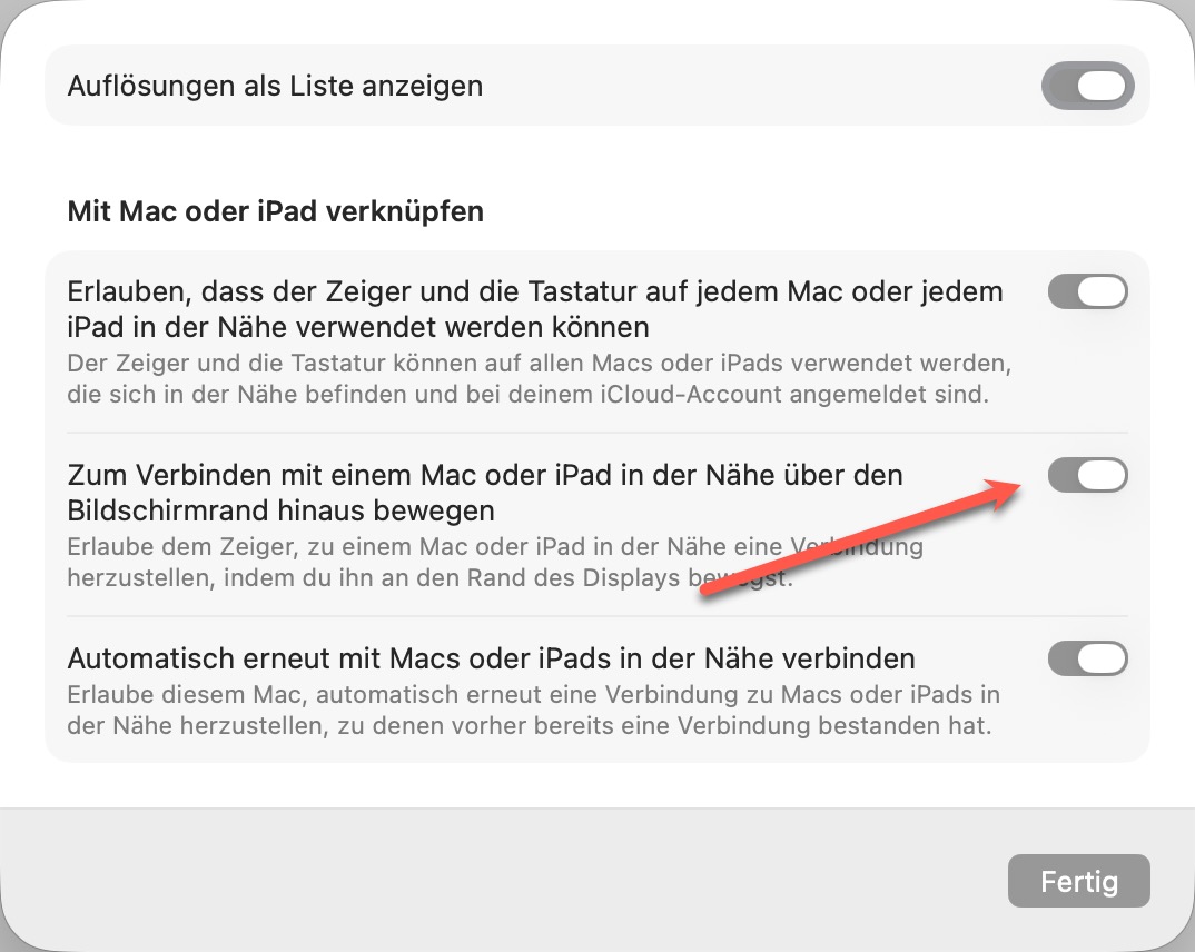 Wenn ich die entsprechenden Einstellungen aktiviere (siehe Bild), kann ich den Mauszeiger problemlos vom Desktop auf das iPad bewegen und dort Aktionen ausführen.