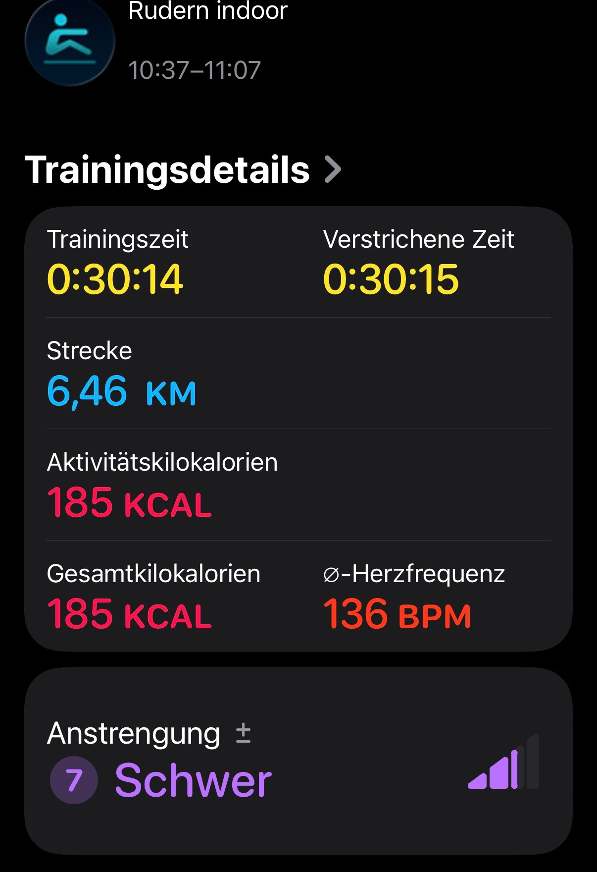 Hallo das Thema wurde scon einmal aufgegriffen. Leider funktionert die Kcal-Berechnung beim "Rudern Indoor" nicht korrekt, obwpohl alle daten hinterlegt wurden. Ich nutze einen POlar H10 Brustgurt, der mit der Apple watc und dem Rudergrät verbunden ist und es gibt nach 30 Minuten Rudertraining einen Unterschied von 70 - 90 Kcal, welche die Apple Watch zu wenig aufzeichnet. Parallel habe ich auch über den Brustgurt verbunden mit der Apple Watch und einer Garmin fenix 8 verglichen, auch hier der gleiche Unterschied. Ich habe auch die App Rowing Workout in Verbindung mit und ohne Brustgurt bei der Apple Watch ausprobiert - im Gegensatz zur fenix 8 belibt der Unterschied, allerdings wird bei der App dir Ruderzüge und die Entfernung fast richtig aufgezeichnet. Zur App muss ich sagen das ich kein Rudergerät besitze, welches keine Kopplung per offenem Bluetooth Standard zulässt, aber mit der fenix 8 stimmen die Daten bzgl. Kcal fast überein.