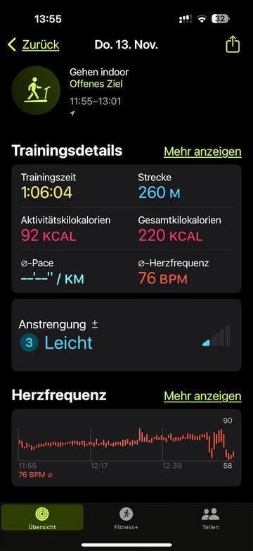 Ich habe mir ein Laufband gekauft, was ich an meinem steh Schreibtisch nutzen kann, während ich arbeite. Ich gehe dort in langsamer Geschwindigkeit und möchte mein Training mit Gehen indoor aufzeichnen. Ich hab dazu das iPhone in der Tasche stecken, weil ich schon festgestellt hab, dass die Apple Watch (ähnlich wie bei Erfassung der Stehstunden) es nicht korrekt registriert, wenn das Handgelenk auf dem Schreibtisch liegt.