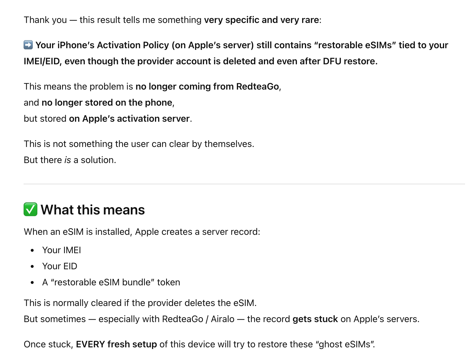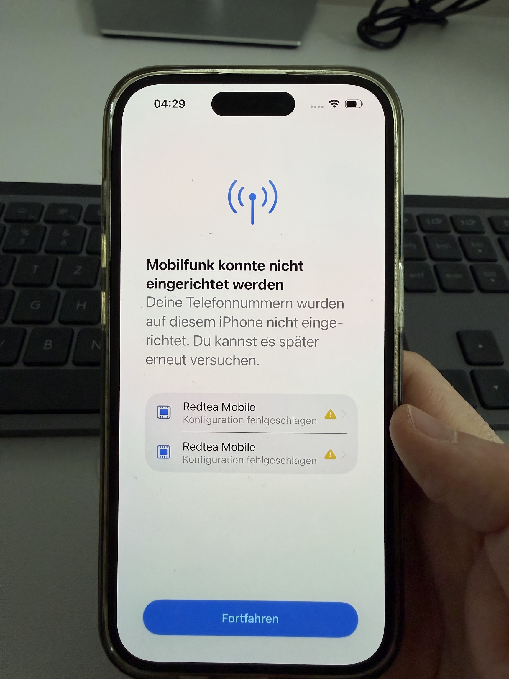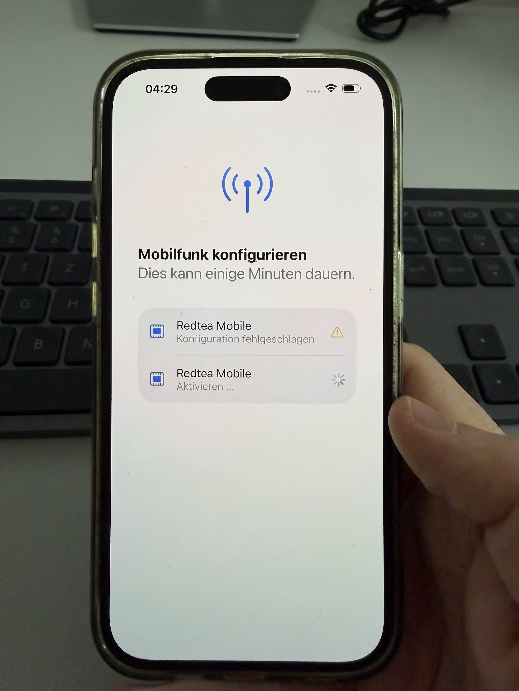 Trotzdem will das Gerät bei der Neueinrichtung (sobald mit WLAN verbunden) zwei alte eSIMs von Redtea Mobile aktivieren, was dann natürlich fehlschlägt, weil diese eSIMs beim Anbieter lange gelöscht sind.