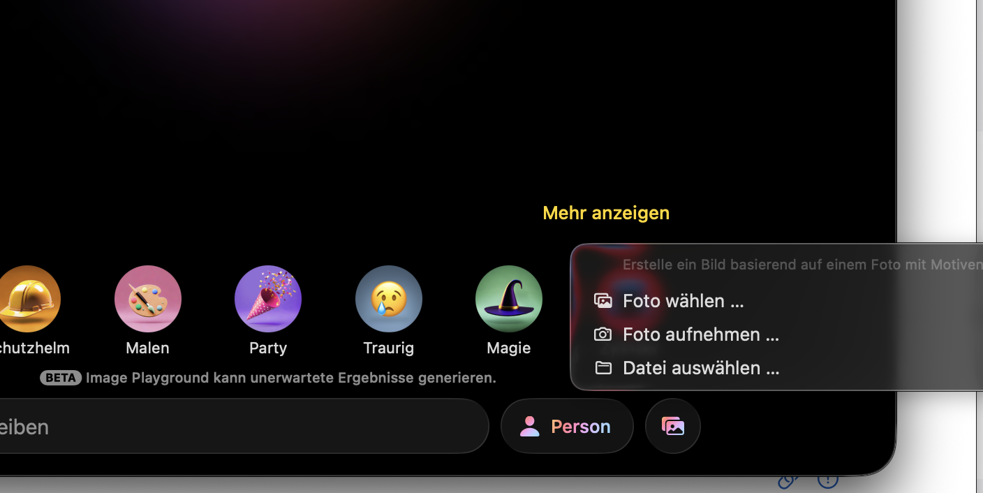 Neben der App „Image Playground“ kannst du auch die „Image Playground“-Funktionen verwenden, um Originalbilder in Apps wie Freeform und „Nachrichten“ zu erstellen. Weitere Informationen findest du unter Originalbilder in der App „Nachrichten“ erstellen und senden und Originalbilder in Freeform erstellen.