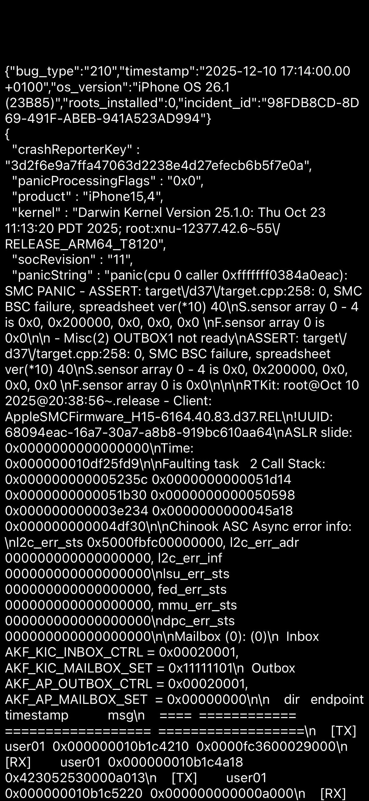 Heute habe ich den Akku getauscht und will das Backcover noch ersetzen. Allerdings besteht jetzt im Probebetrieb das Problem immer noch mit dem Neustart. Jetzt sogar so, dass er alle 2min neu bootet. Ich habe in der Analyse Panic Full Dateien gefunden. Kann die hier jemand analysieren? Ob es durch Software oder kaputte Hardware kommt