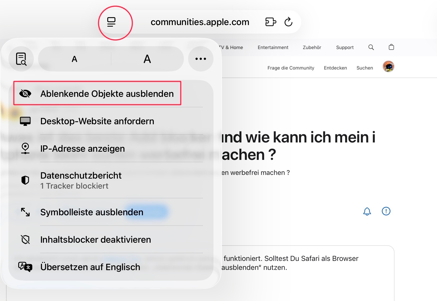 Solltest Du Safari als Browser benutzen, kannst Du aber auch die Option „Ablenkende Objekte ausblenden“ nutzen (siehe Bild).