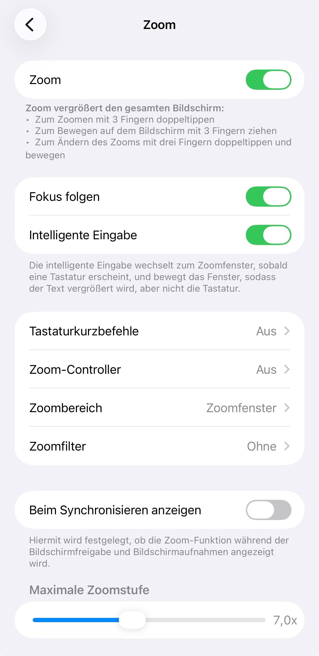 Trotz aktiviertem Schalter in den Bedienungshilfen lässt sich der Zoom nicht durch Doppeltippen mit 3 Fingern einschalten. iPhone 17 Pro Max mit iOS 26.1