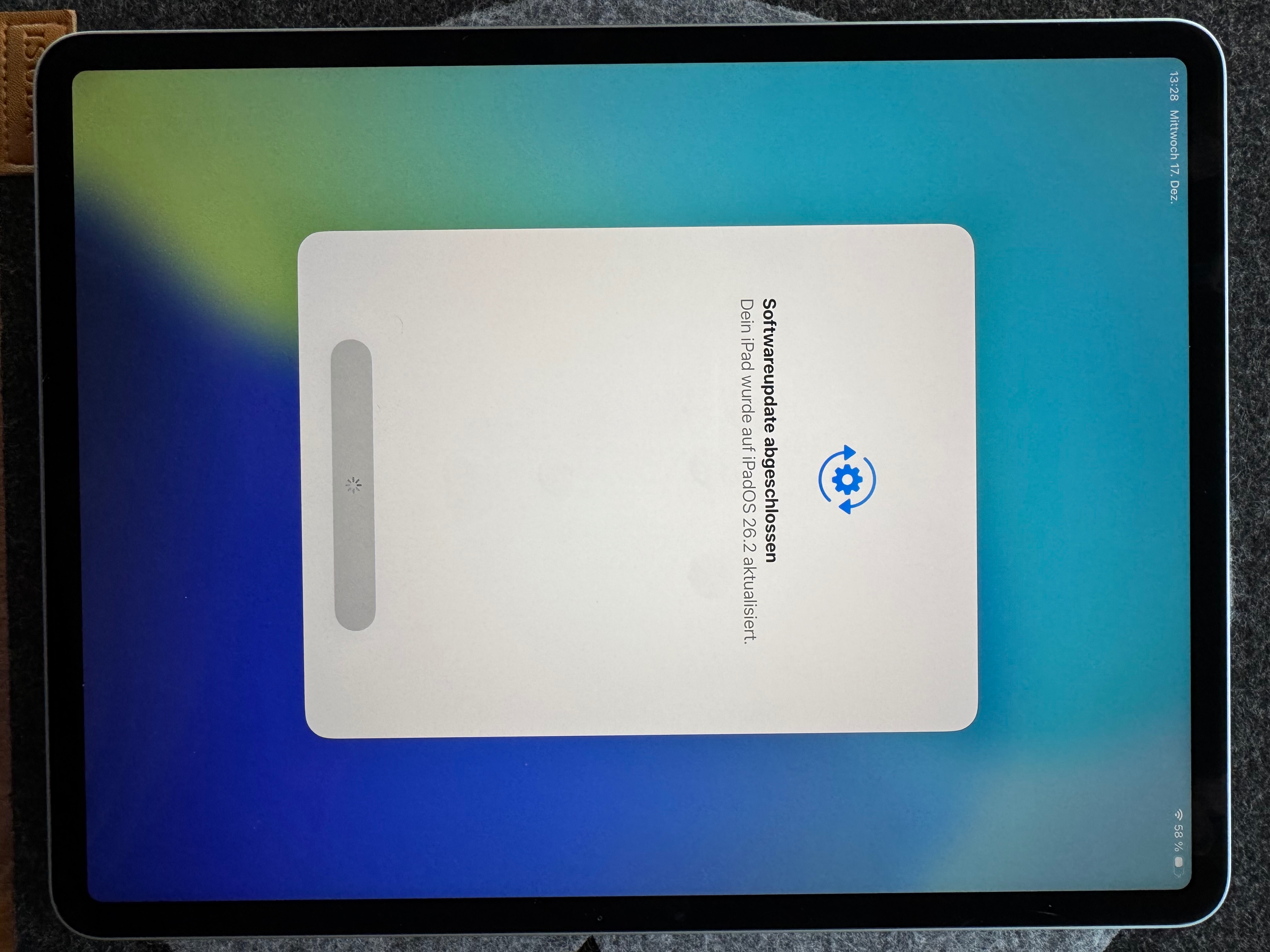 Das iPad bleibt bei dem: Software abgeschlossenen. Dein iPad wurde auf IpadOS 26.2 aktualisiert Bildschirm stehen. DerLadekreis unten auf dem grauen Button dreht sich die ganze Zeit.