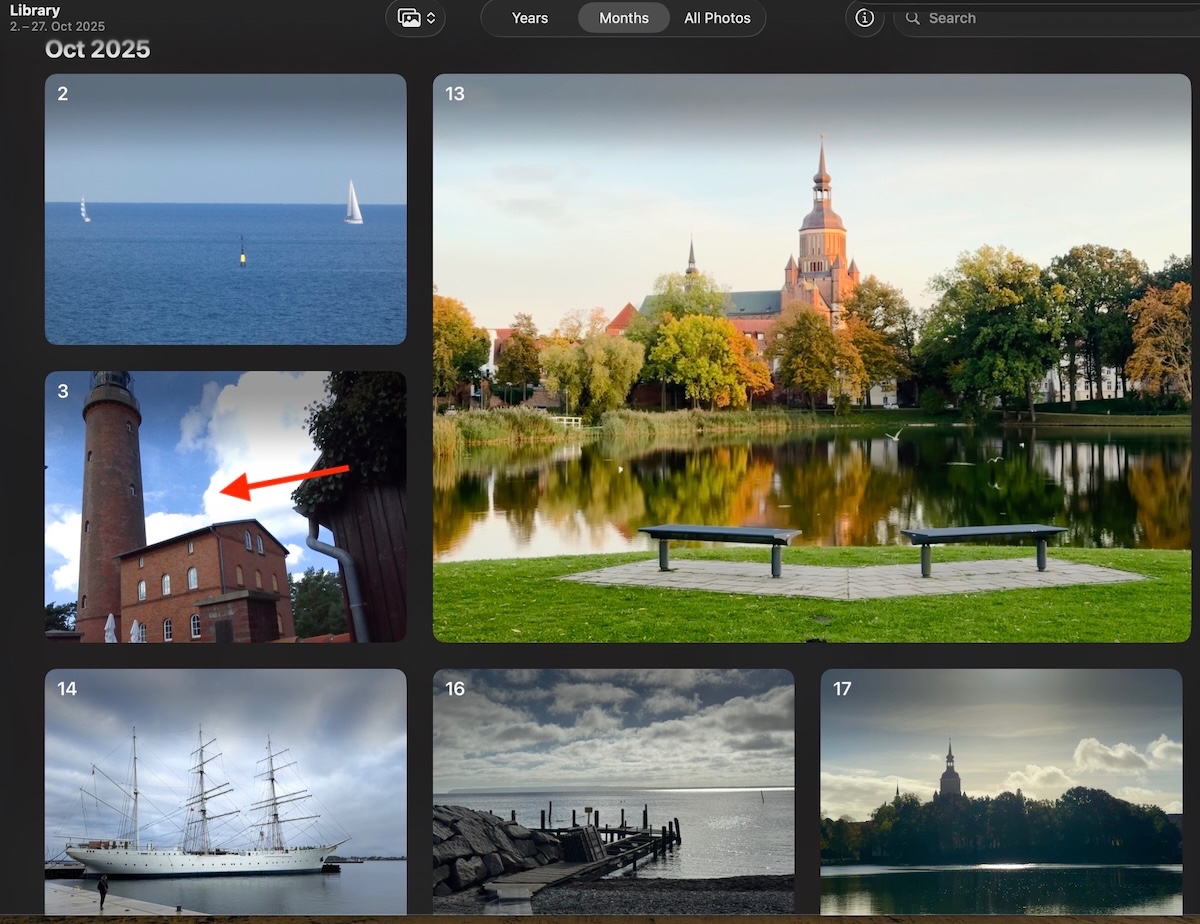 Das problem ist, dass die gruppierten Zusammenfassungen in den Monaten mehr nach Gesichtspunkten ausgewählt werden, was sich grafisch gut arrangieren lässt, aber nicht unbedingt vollständig sein sollen. Es werden nicht unbedingt alle Tage in den Monaten angezeigt, auch nicht alle Favoriten. Es dient eigentlich nur dazu, eine Auswahl der Fotos nett anrangiert darzustellen, und wir kommen von dieser Aussicht schnell zur richtigen Stelle in "Alle Fotos".