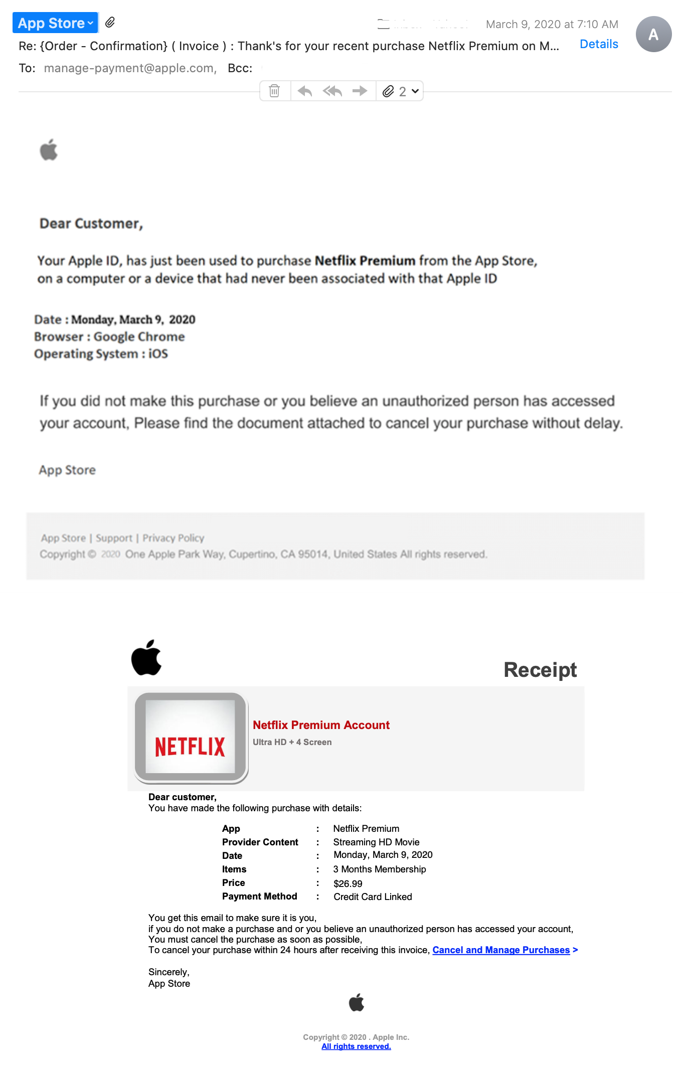 • A variant of the same scam takes the form of an emailed receipt for an iTunes Store or App Store purchase you did not make. The email will contain a link soliciting your Apple Account credentials to confirm the alleged purchase. Both the link and the receipt are fraudulent.