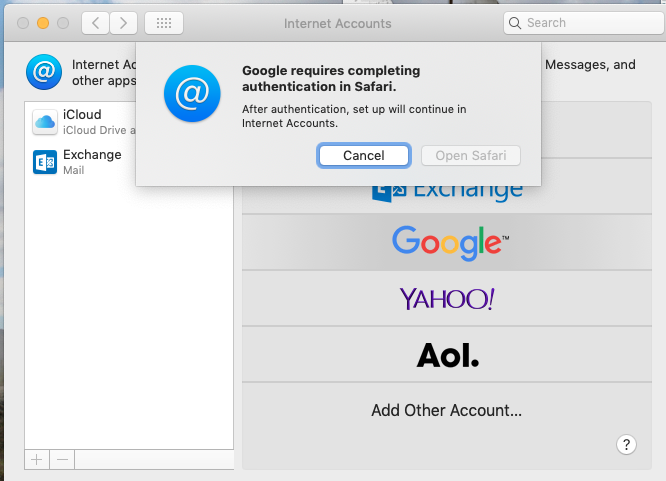 Is anyone else seeing this problem? My MacBook Pro just updated and my mail began to fail to update. When I removed the Google account and tried to add it back again I keep hitting this dead-end. When I select "Open Safari" button I get absolutely nothing in Safari.