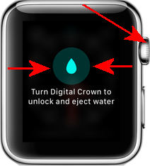 turn your Digital Crown away from you in one continuous movement until the animated water droplet fills the circle on the screen. Your Apple Watch will then start beeping and vibrating multiple times. This is to allow any water in the speaker grill to escape.