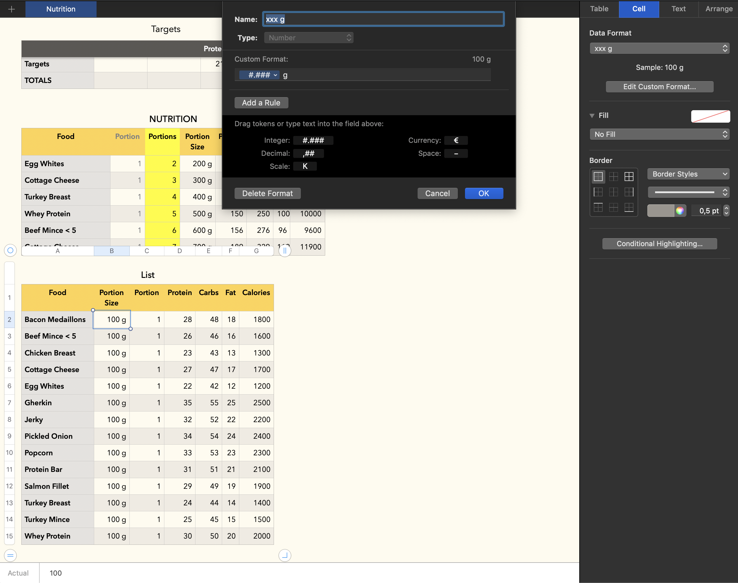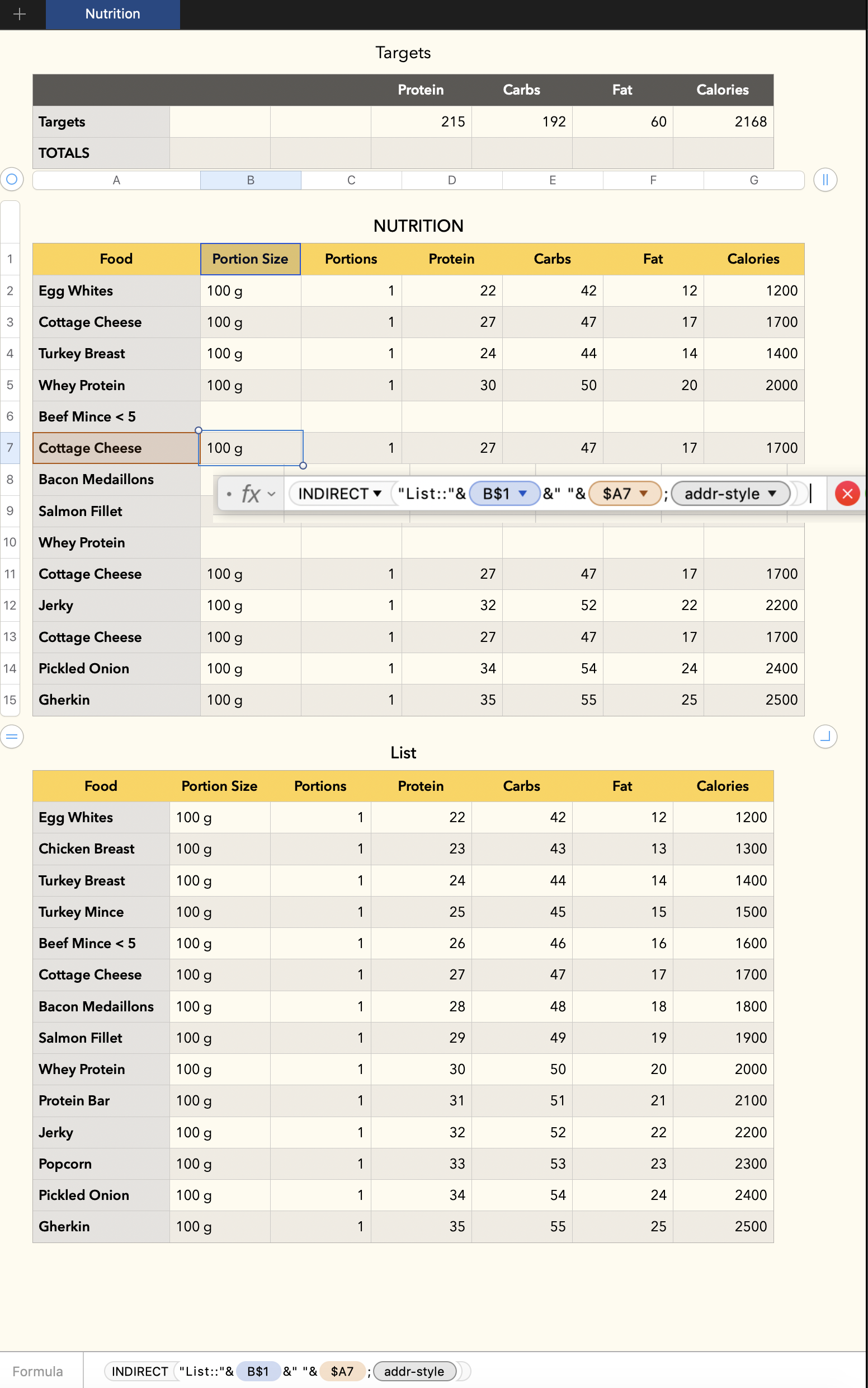 Take time to reread as necessary, then enter the formula as shown, into B7 of your Nutrition table, replacing $A6 with $A7 to fit that location.