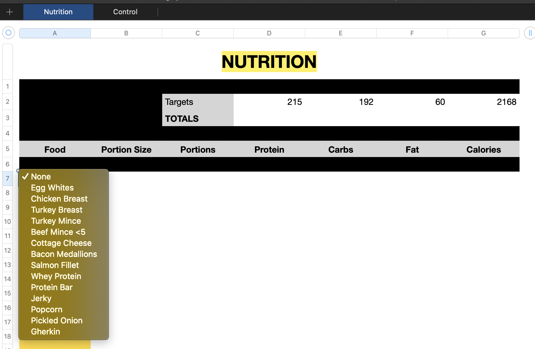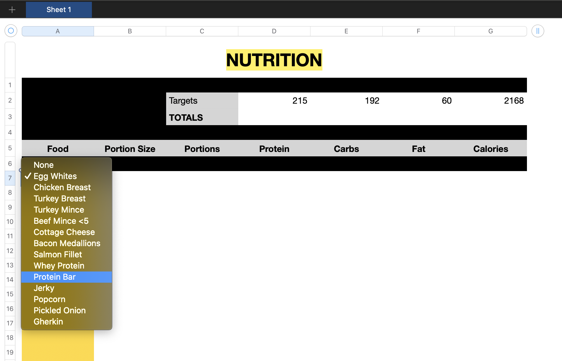 Cells A6 to A14 of Nutrition contain copies of the popup menu list shown in this image. As no food has been chosen yet, the cells to the right of column A are all 'blank'.